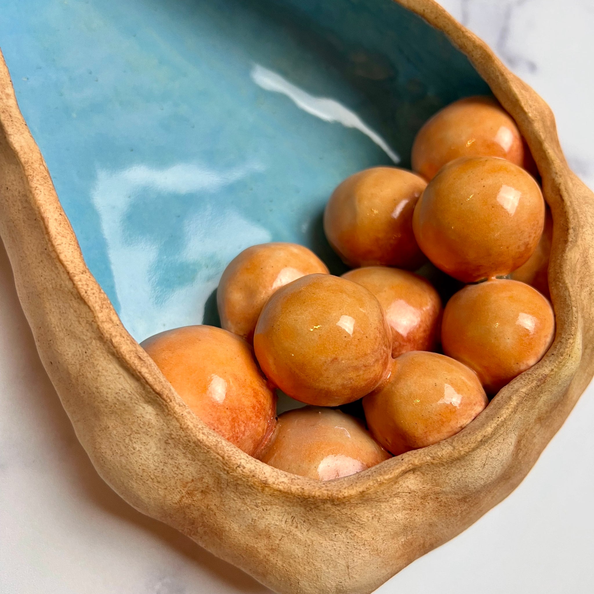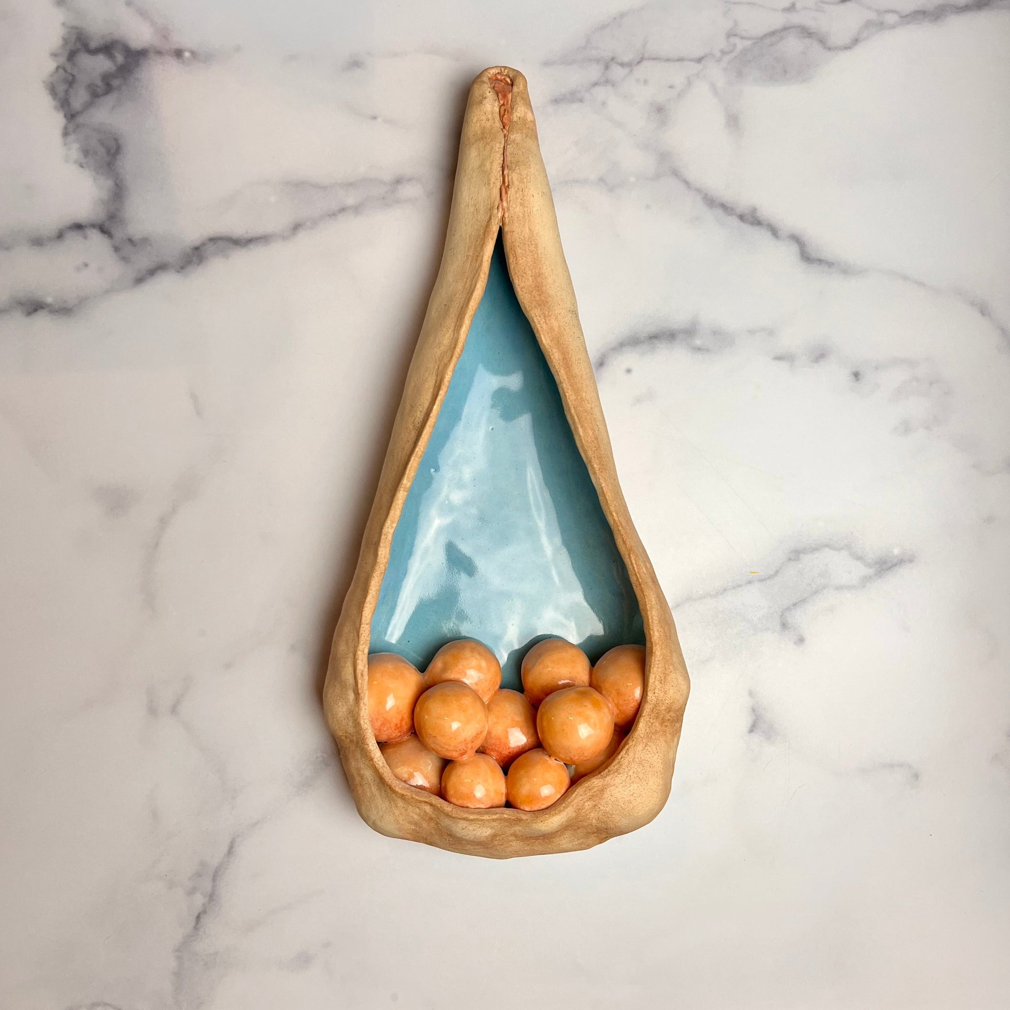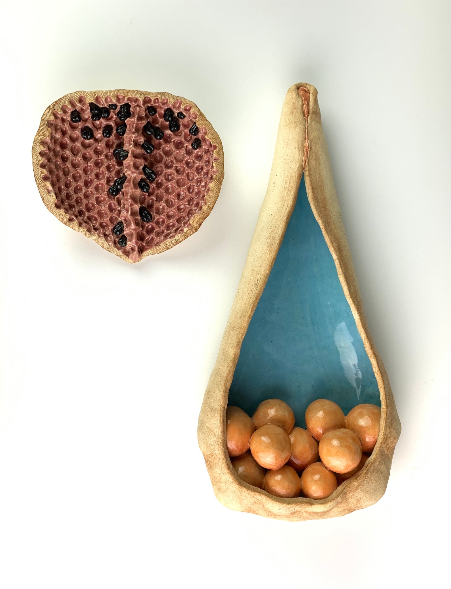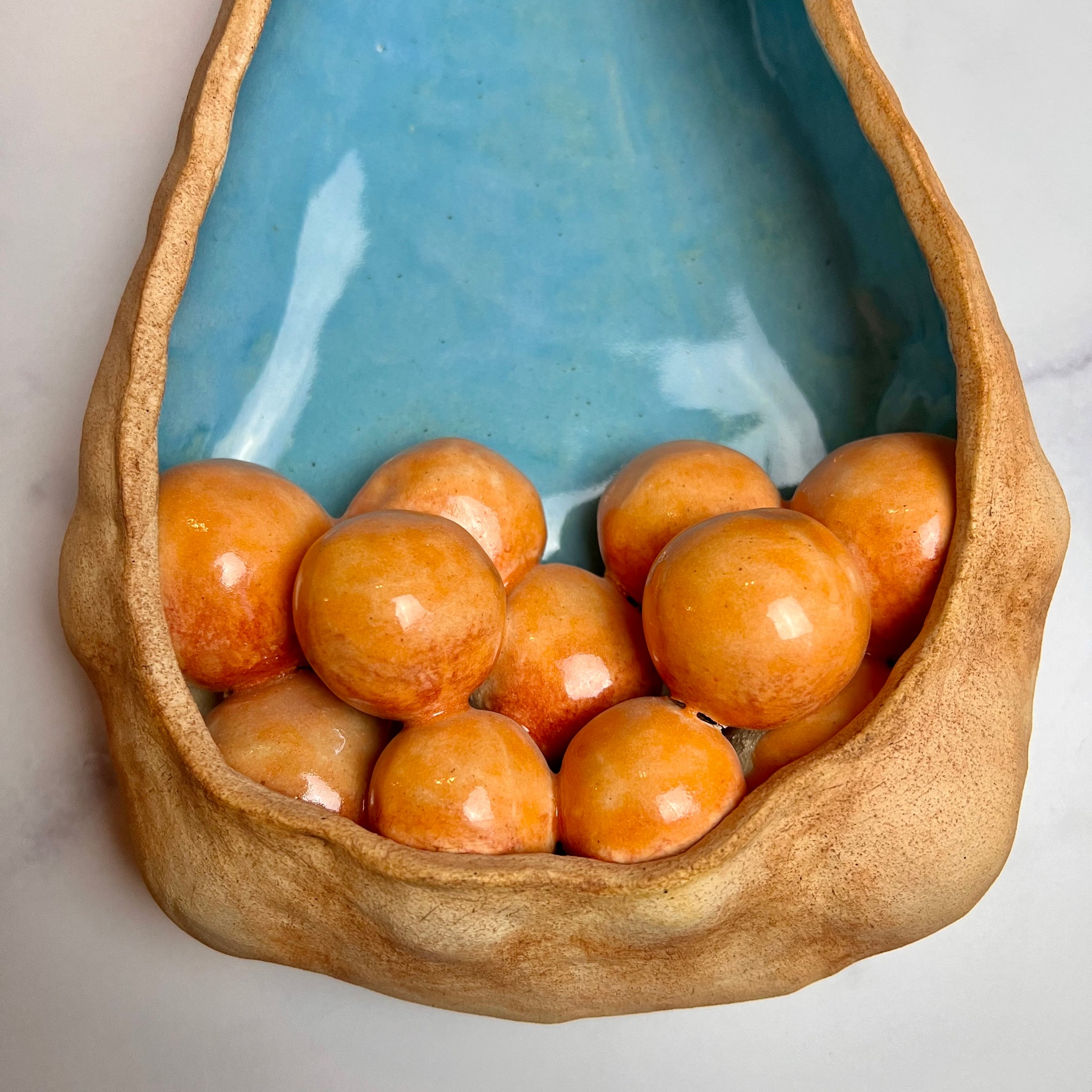 Nesting Seeds, was sculpted in Stoneware clay and finished with bright interior colors. While inspired by Seeds, It indeed has a hint of birdlife, as eggs hanging safely, out of harms reach in a natural basket.