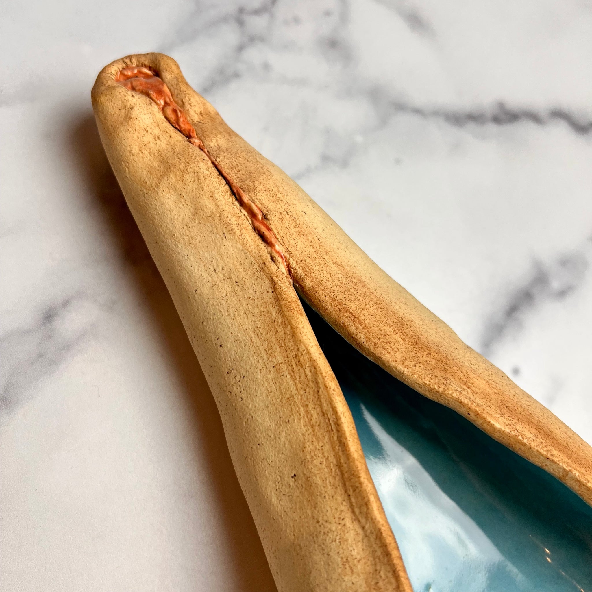As I create these succulent plant forms in clay I begin with a slab of clay to be formed, I then arrange root, vine or seed formations of the plant allowing it to develop organically as i shape it into a seemingly growing, fertile figure. I form the pods, working toward the heart of the plant, instinctually feeling my way toward the seeds, then revealing the budding form I envision there, and finally, the plant blossoms with rich vibrant, alluring color.