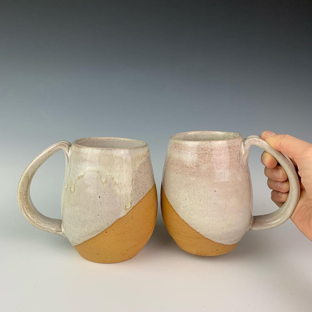 Showing two mugs from the coffee gift set including two angle dipped coffee mugs, one coffee pour over and a matching bud vase. handcrafted, wheel thrown stoneware pottery