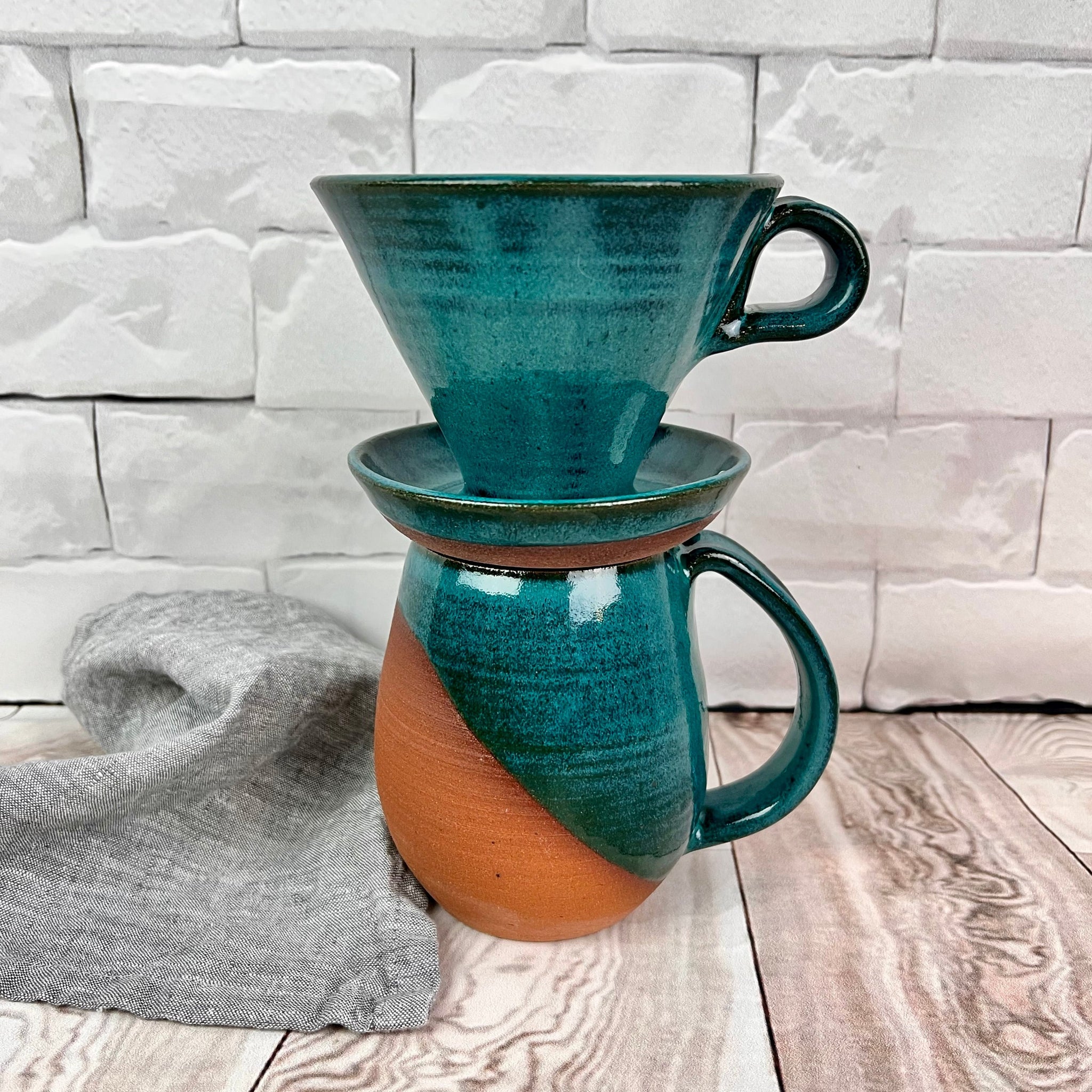 Showing an angle dipped mug and pour over in Teal. handcrafted, wheel thrown stoneware pottery