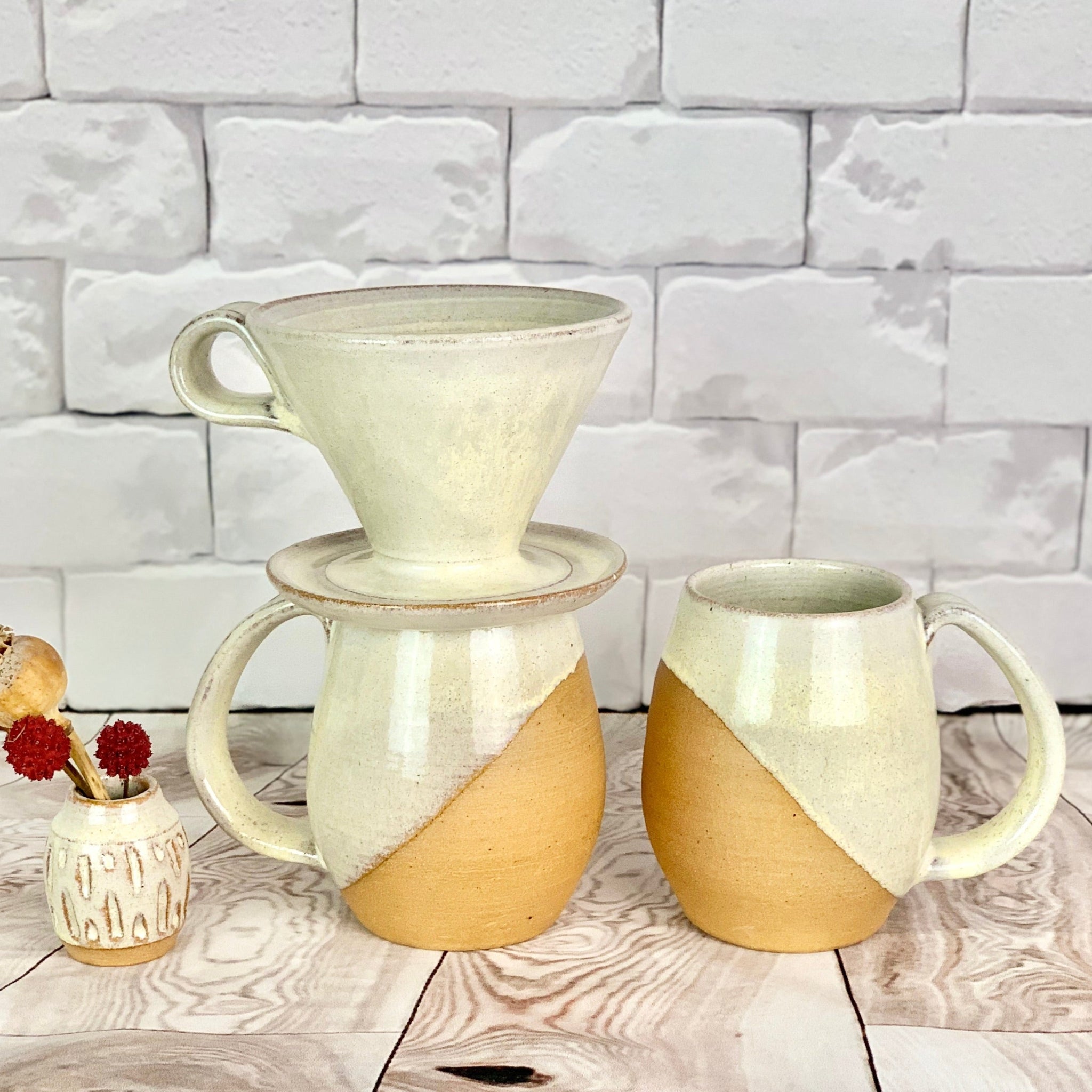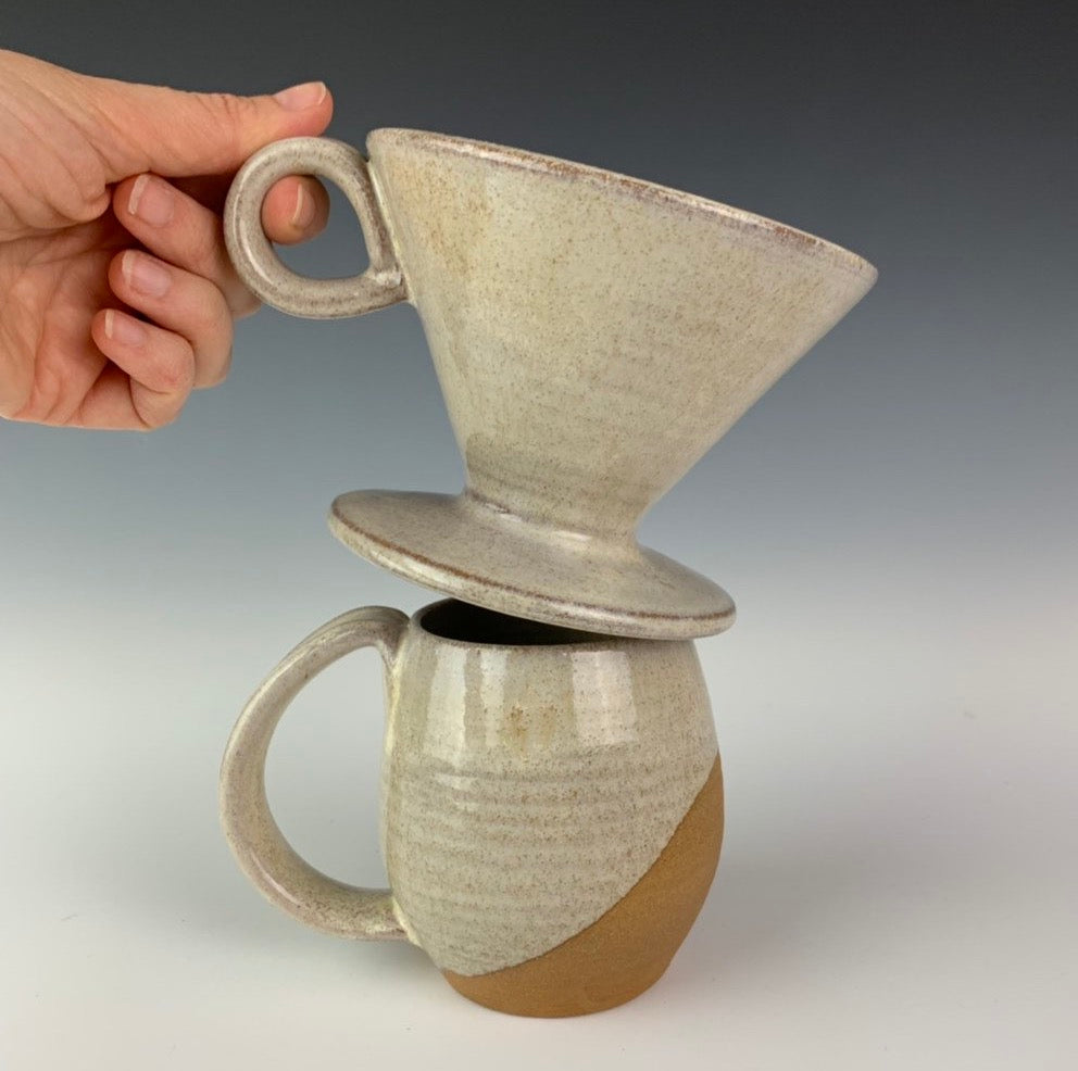 showing the pour over and one mug from the coffee gift set including two angle dipped coffee mugs, one coffee pour over and a matching bud vase. handcrafted, wheel thrown stoneware pottery