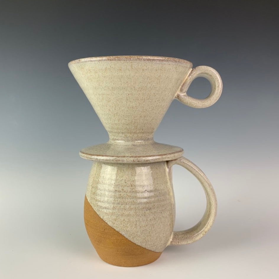 showing one mug and pour over from the coffee gift set including two angle dipped coffee mugs, one coffee pour over and a matching bud vase. handcrafted, wheel thrown stoneware pottery