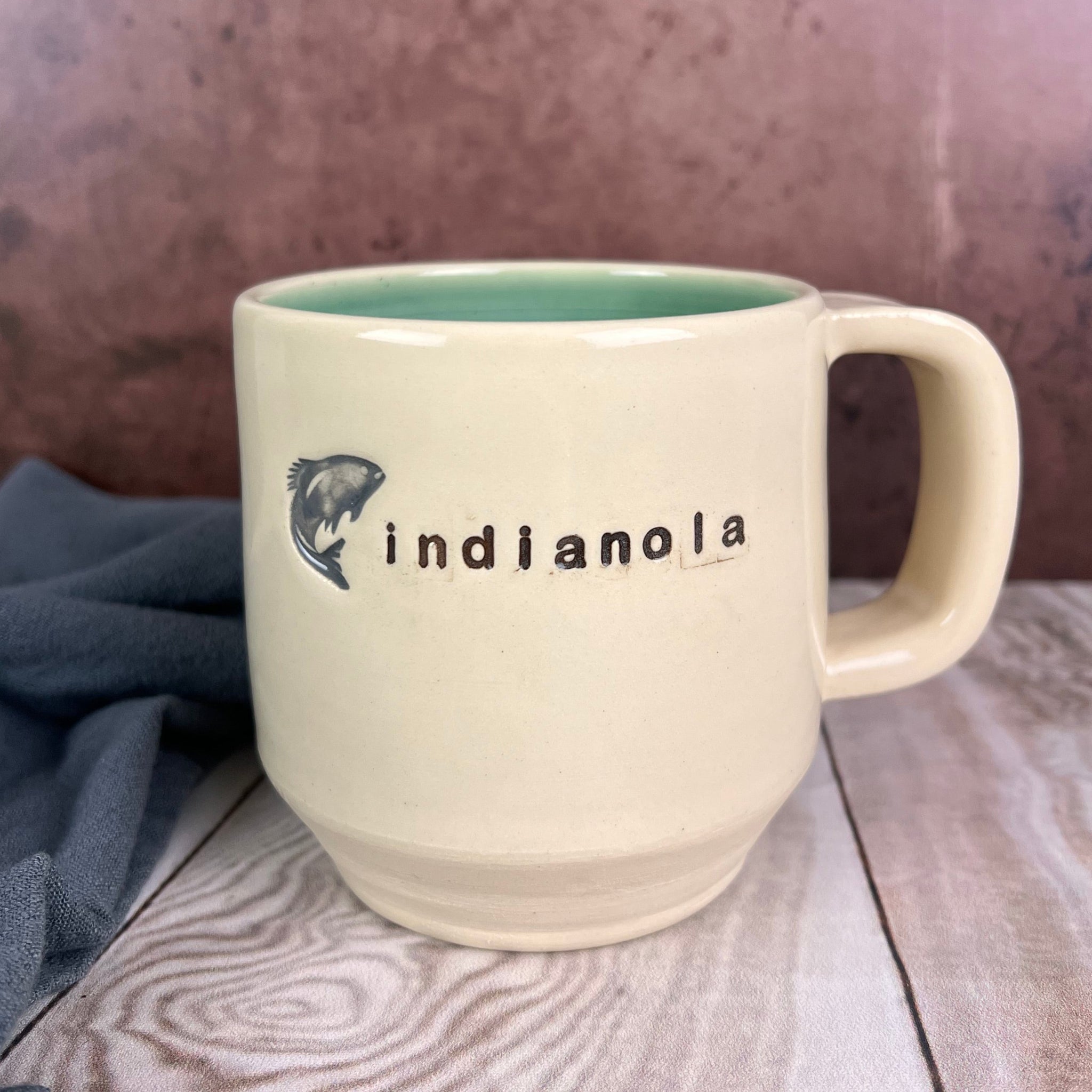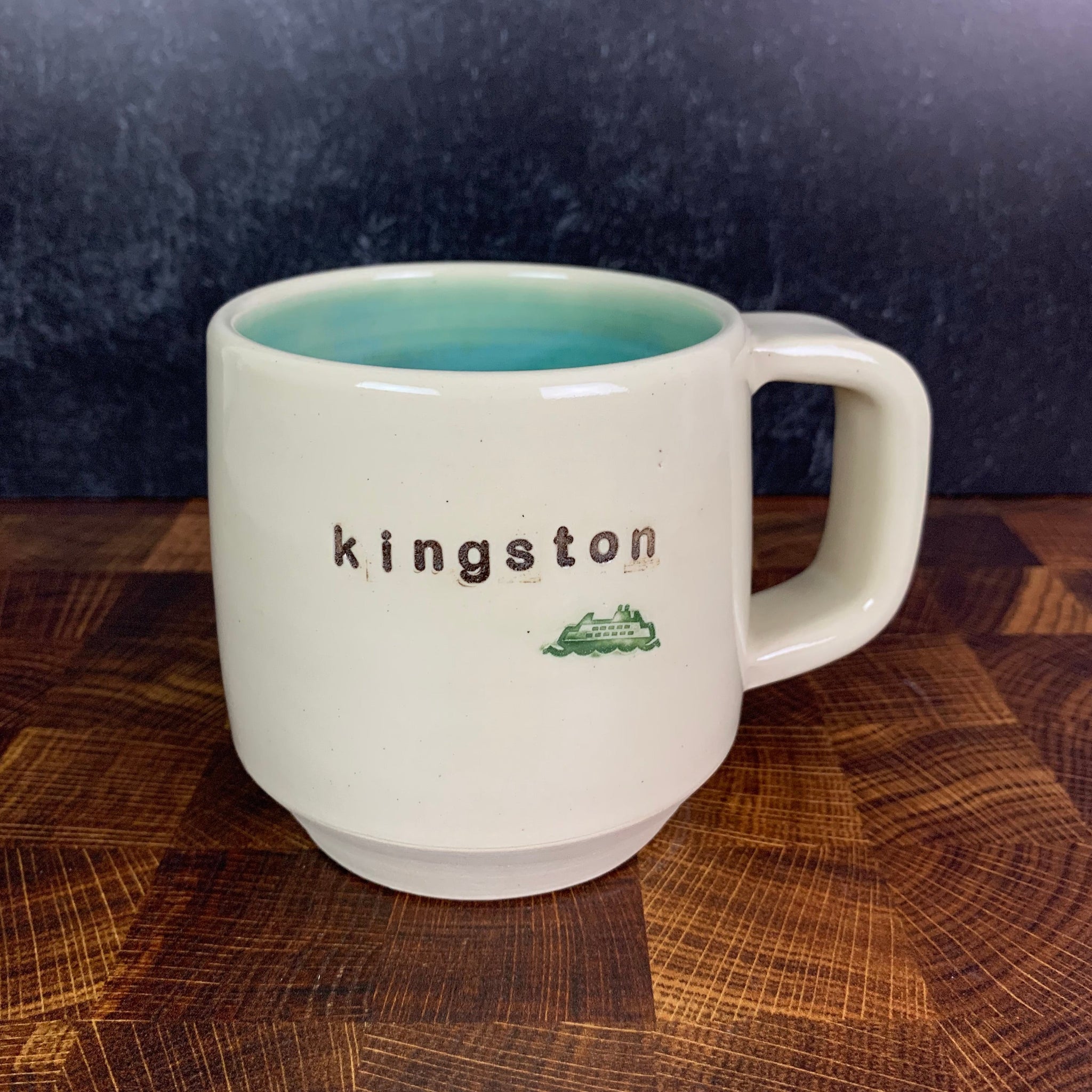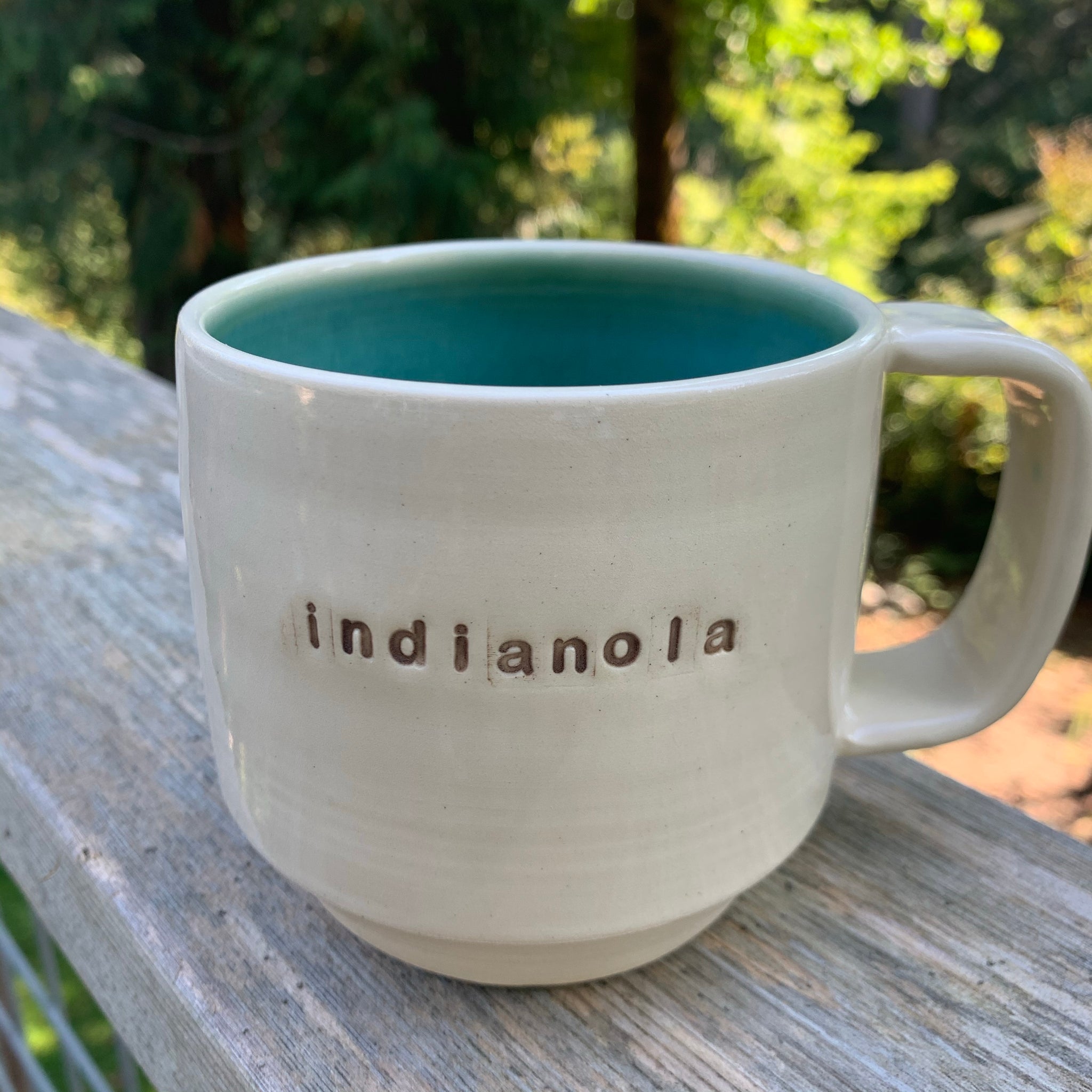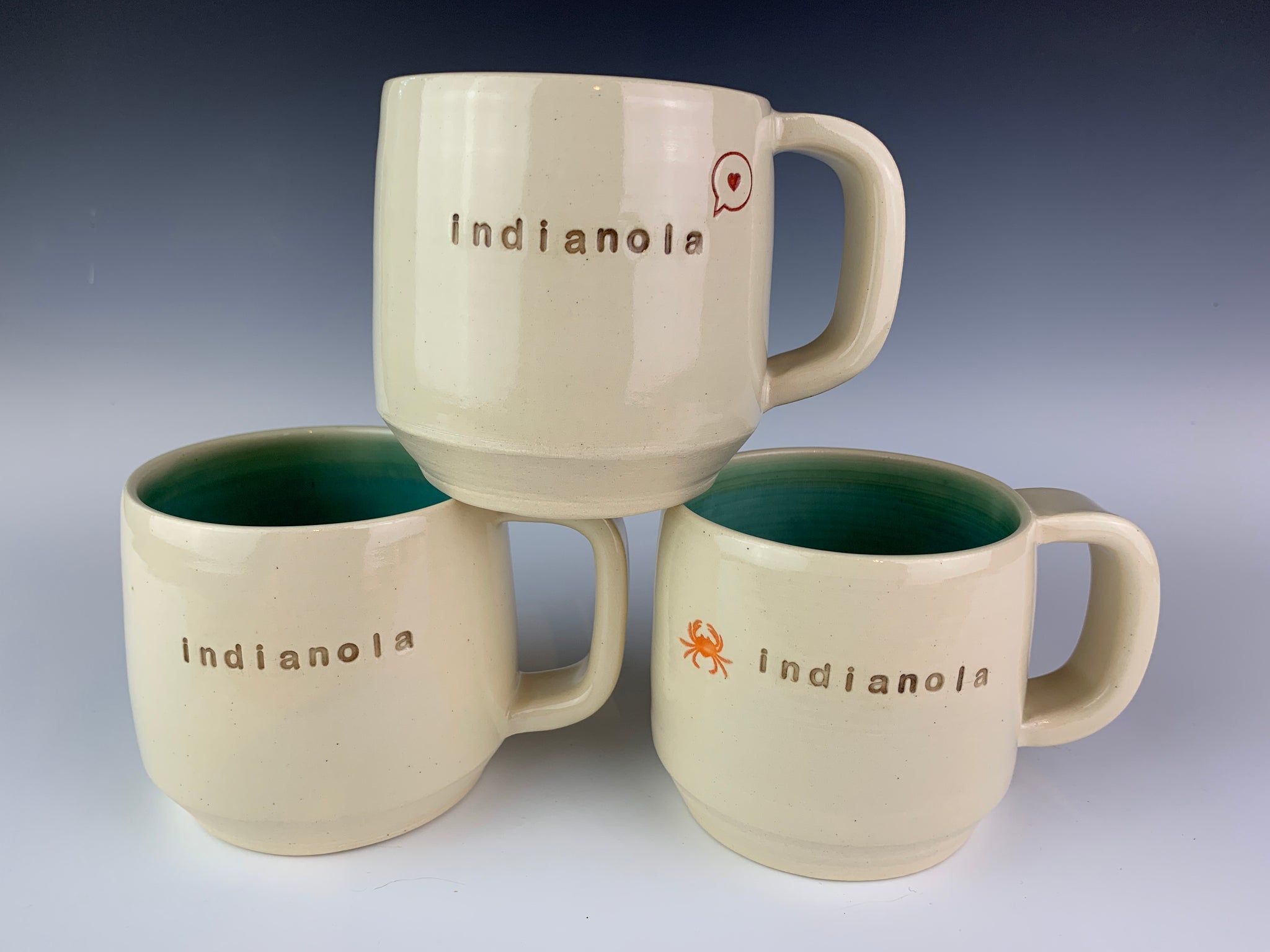 The letters are actually inset into the mug, so you can feel the texture, they are not merely painted on the surface. The cup is a lovely white clay with a beautiful turquoise green glaze on the inside.