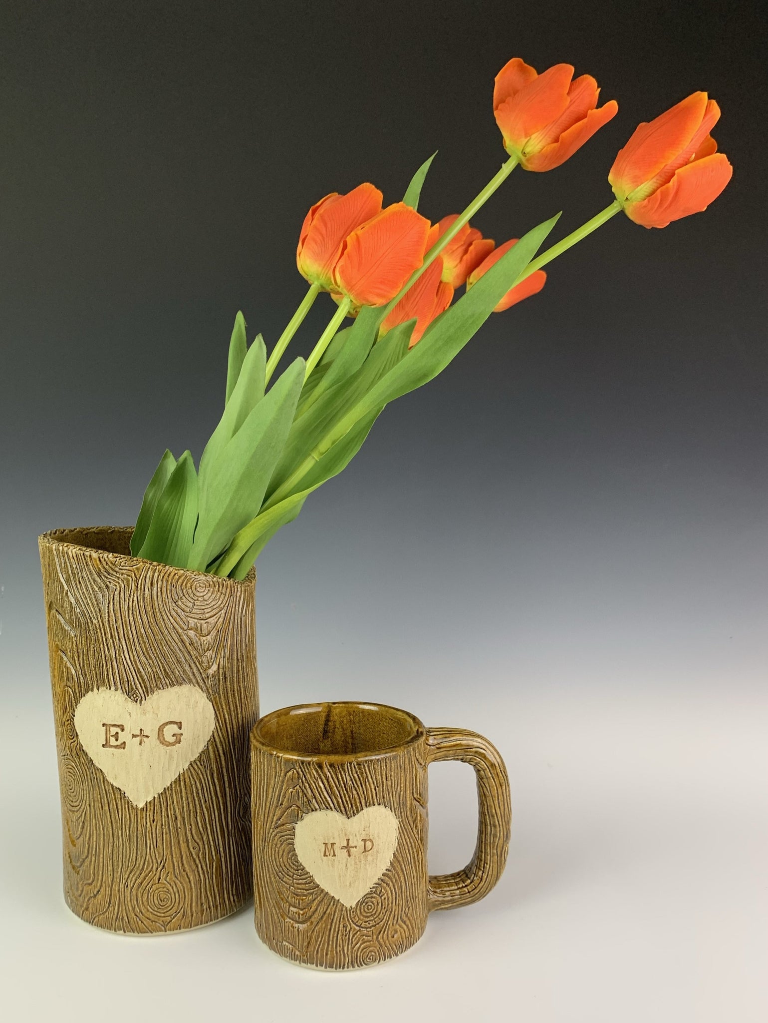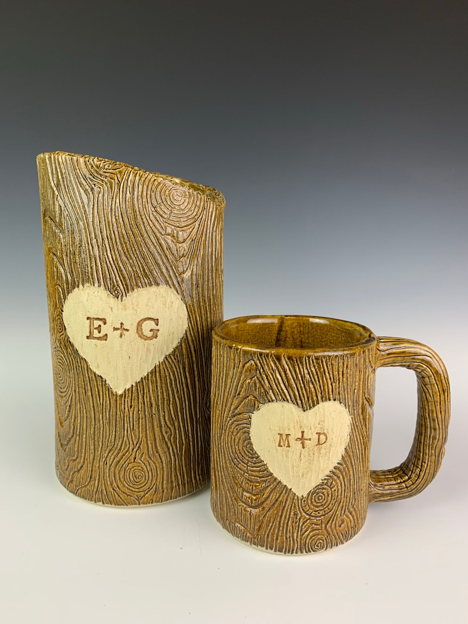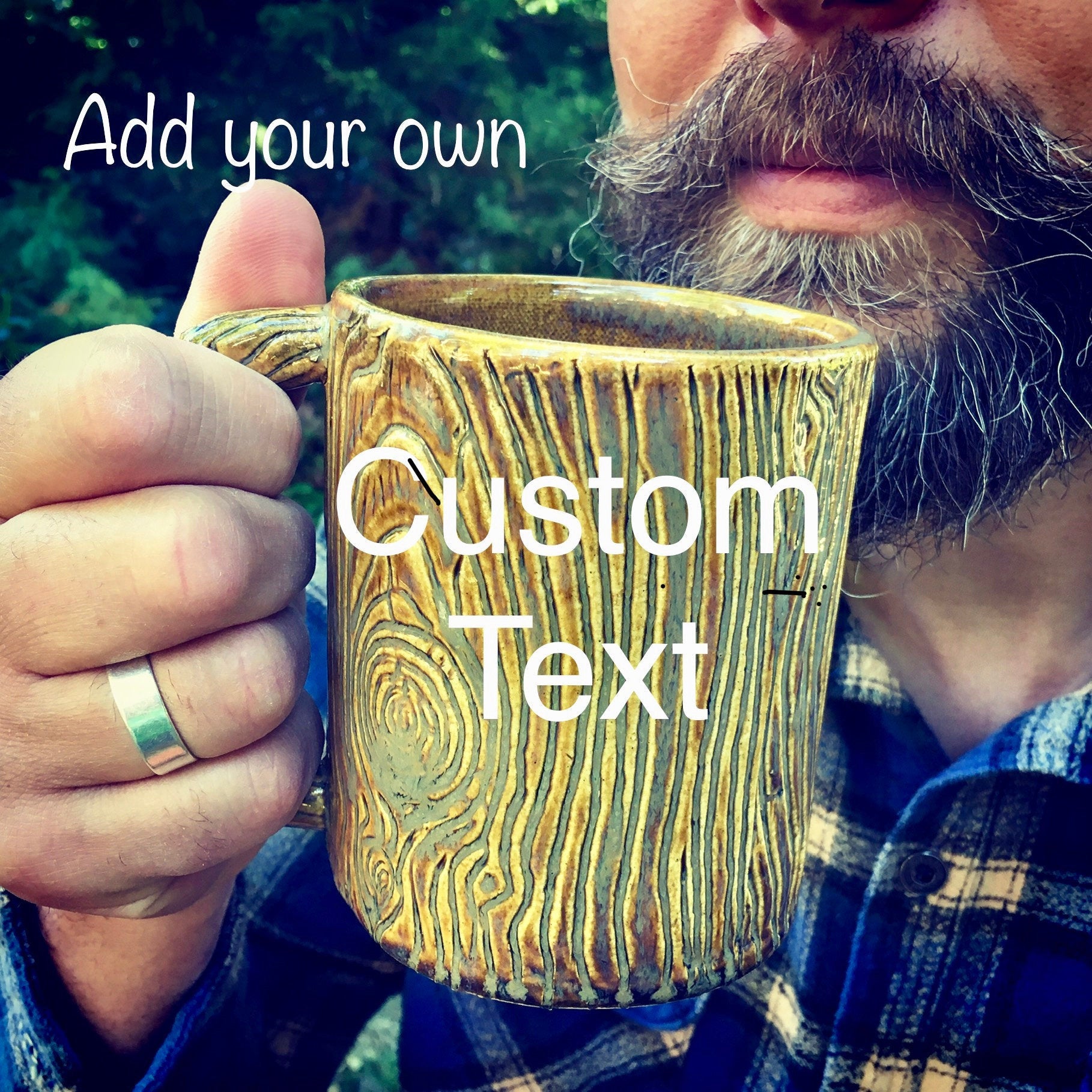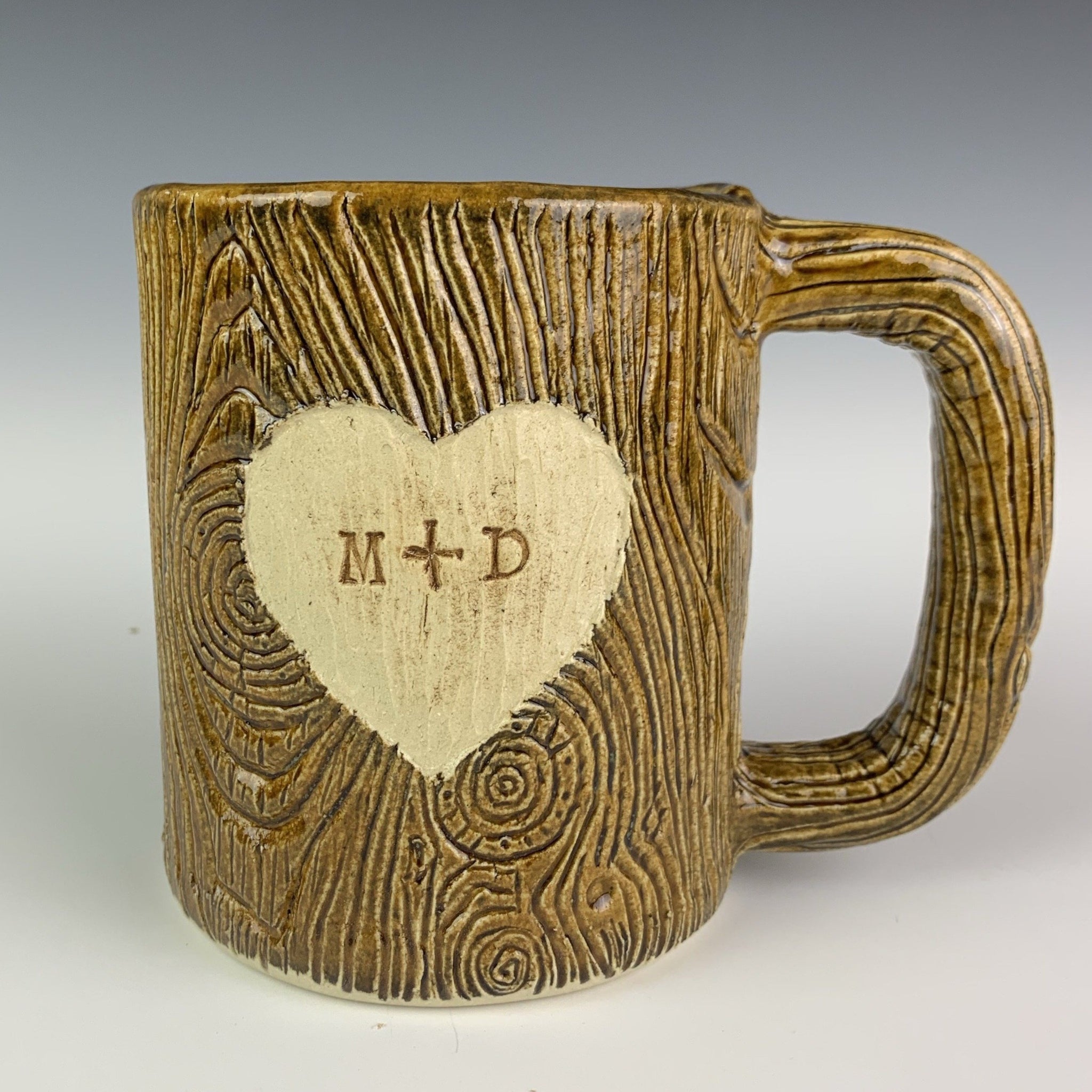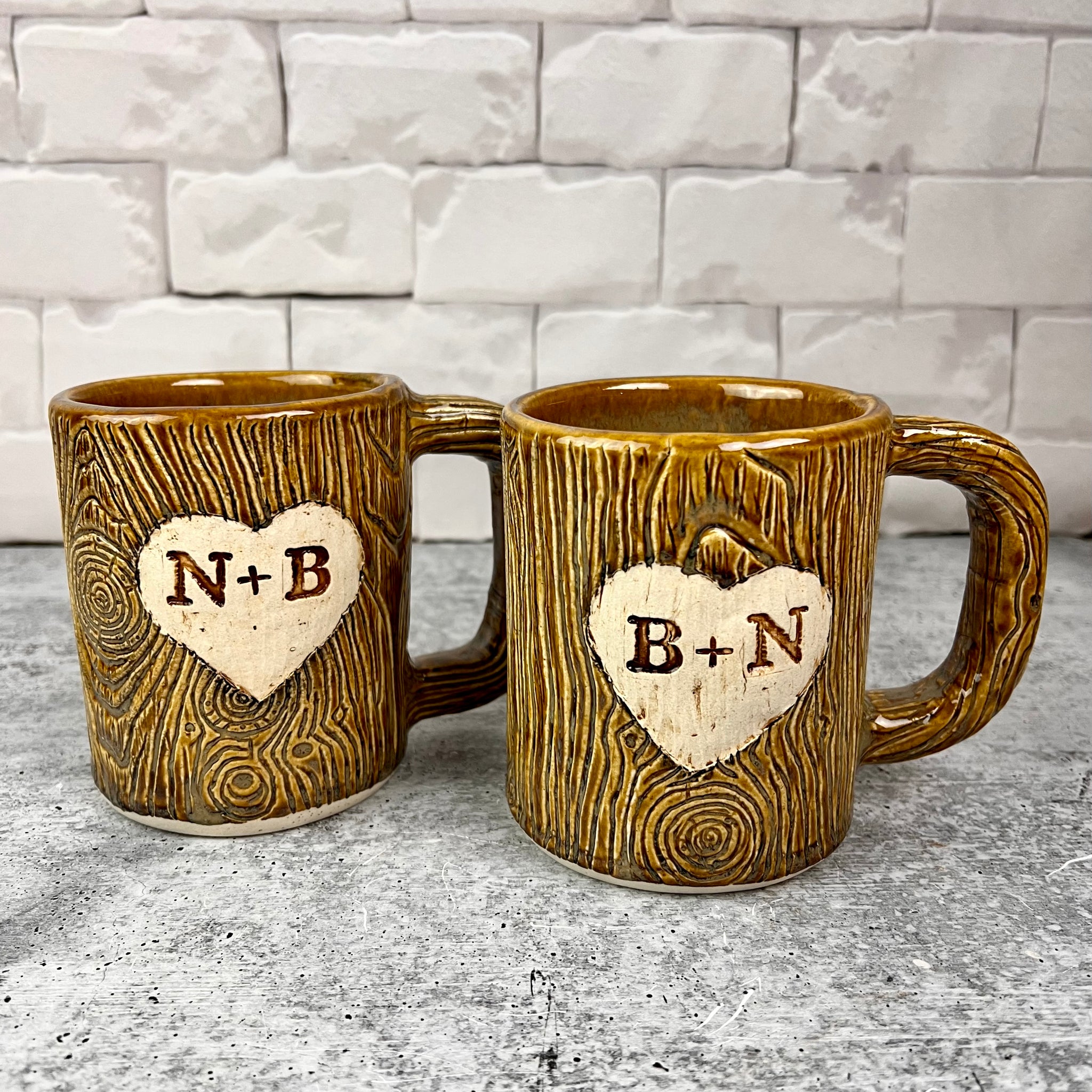 Custom Text available for your sweetie, or the newlyweds. I carve into the surface so that it looks as though the tree textured mug has a carving in it. Initials in a heart is pretty sweet. This is the perfect morning wood coffee cup for the Lumbersexual, wood worker, beard enthusiast, woodsman or rustic woman in your life, and truly a wonderful custom wedding gift when you you order two as a matched set.