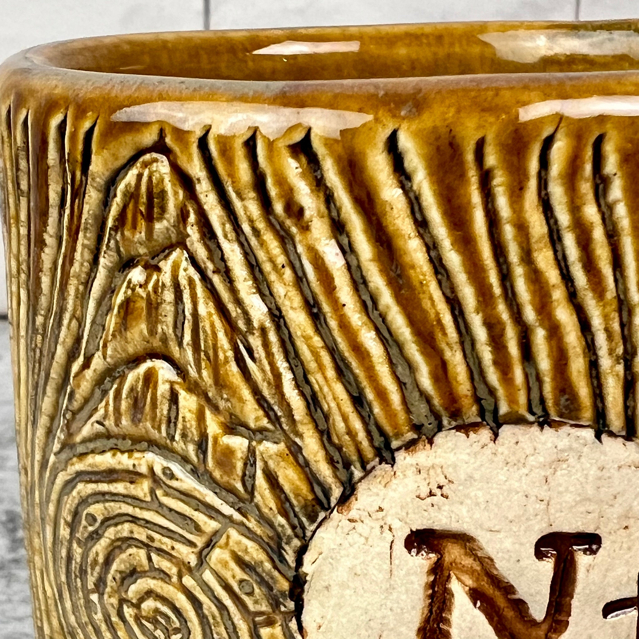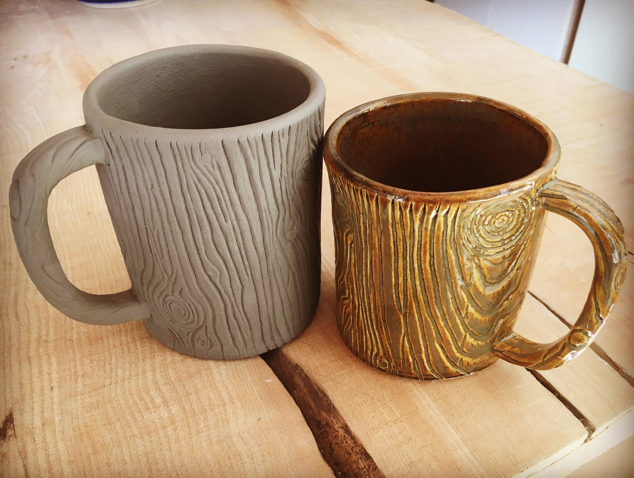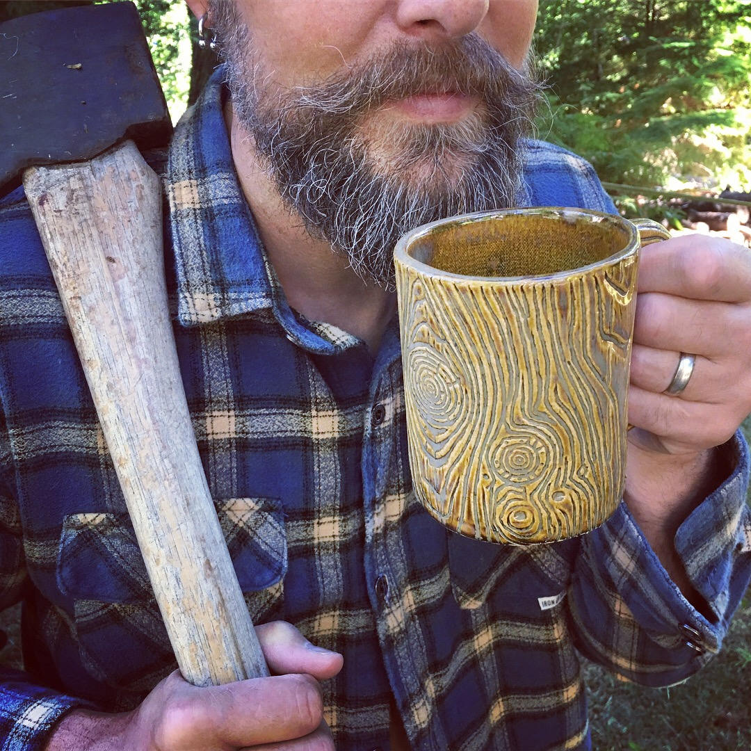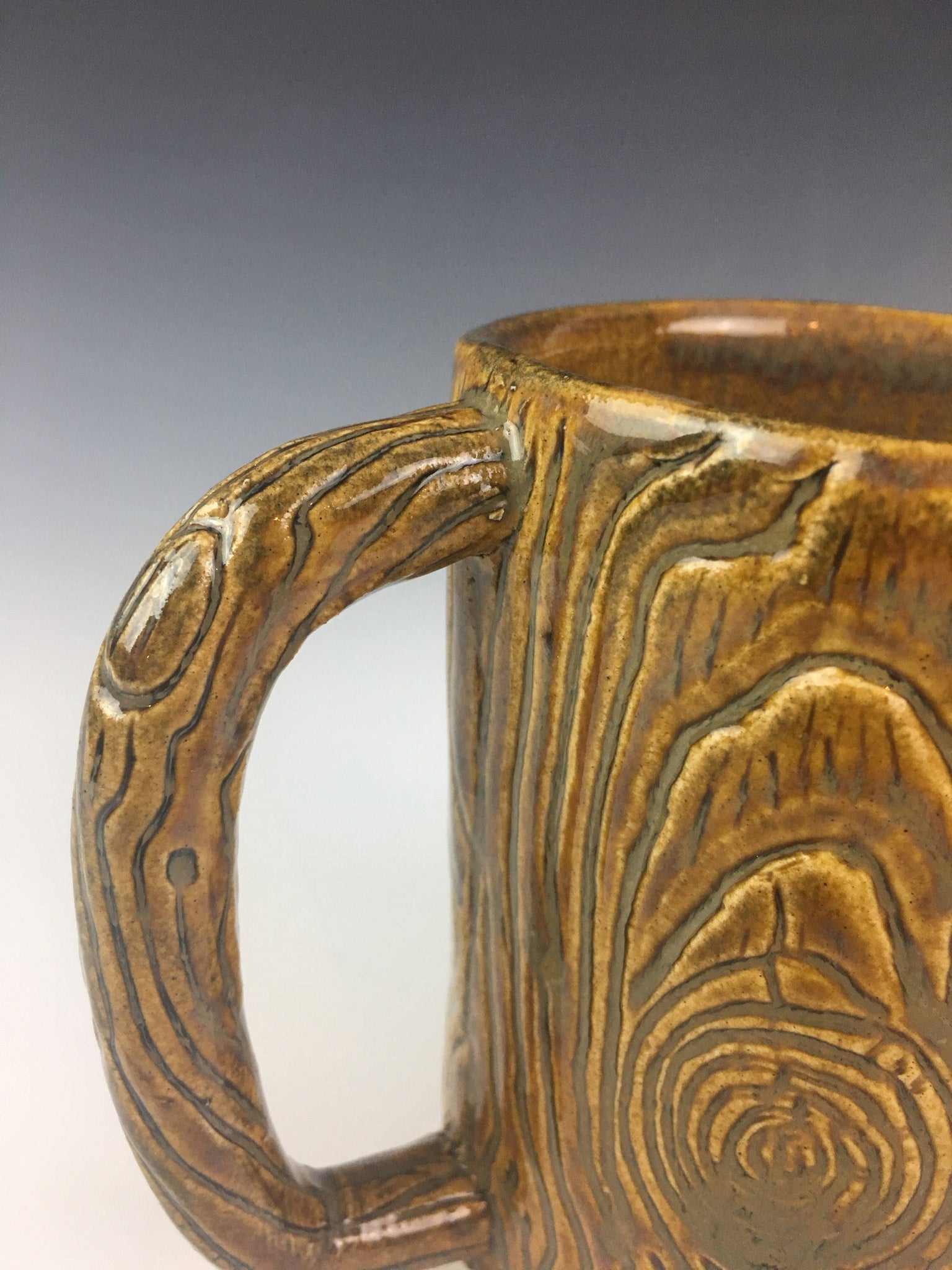 The handmade pottery Lumberjack mug holds approximately 16oz of coffee, tea or beverage of your choice. Yes, you can actually feel the faux woodgrain texture as well as the carved in elements. Comfortable, roomy handle, manly-mug size, lead-free glaze, dishwasher and microwave safe. Handmade by Meredith in her Fern Street Pottery Studio. See my shop for more handmade originals! I also make this style in vases. No two are exactly alike, but sets are very well matched. Made one at a time, by hand, in the woods.