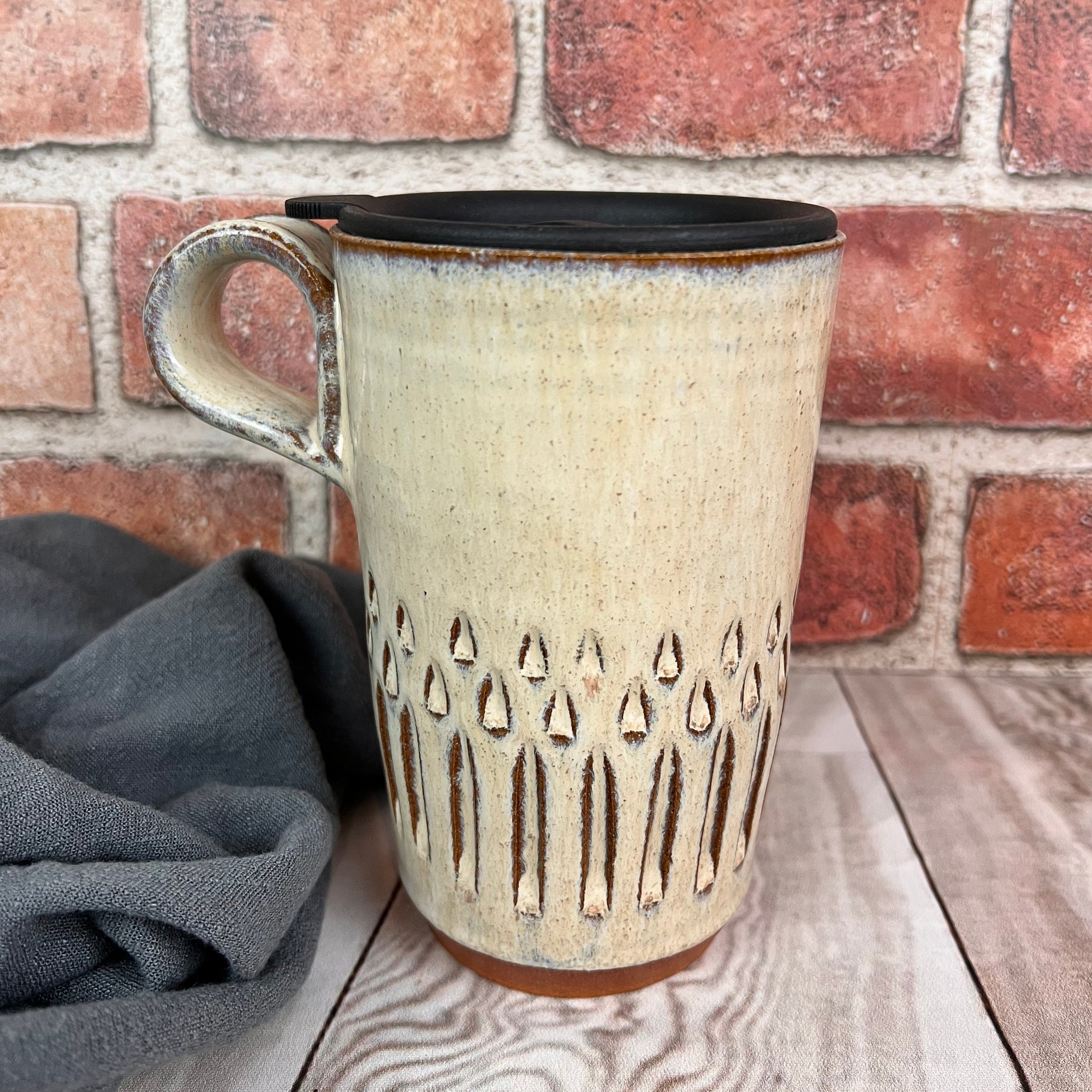 a wheel thrown pottery travel mug. each one is hand carved, this version is the "vertical pattern" carving. finger loop handle, shown here with fitted travel lid, fits into most cup holders.