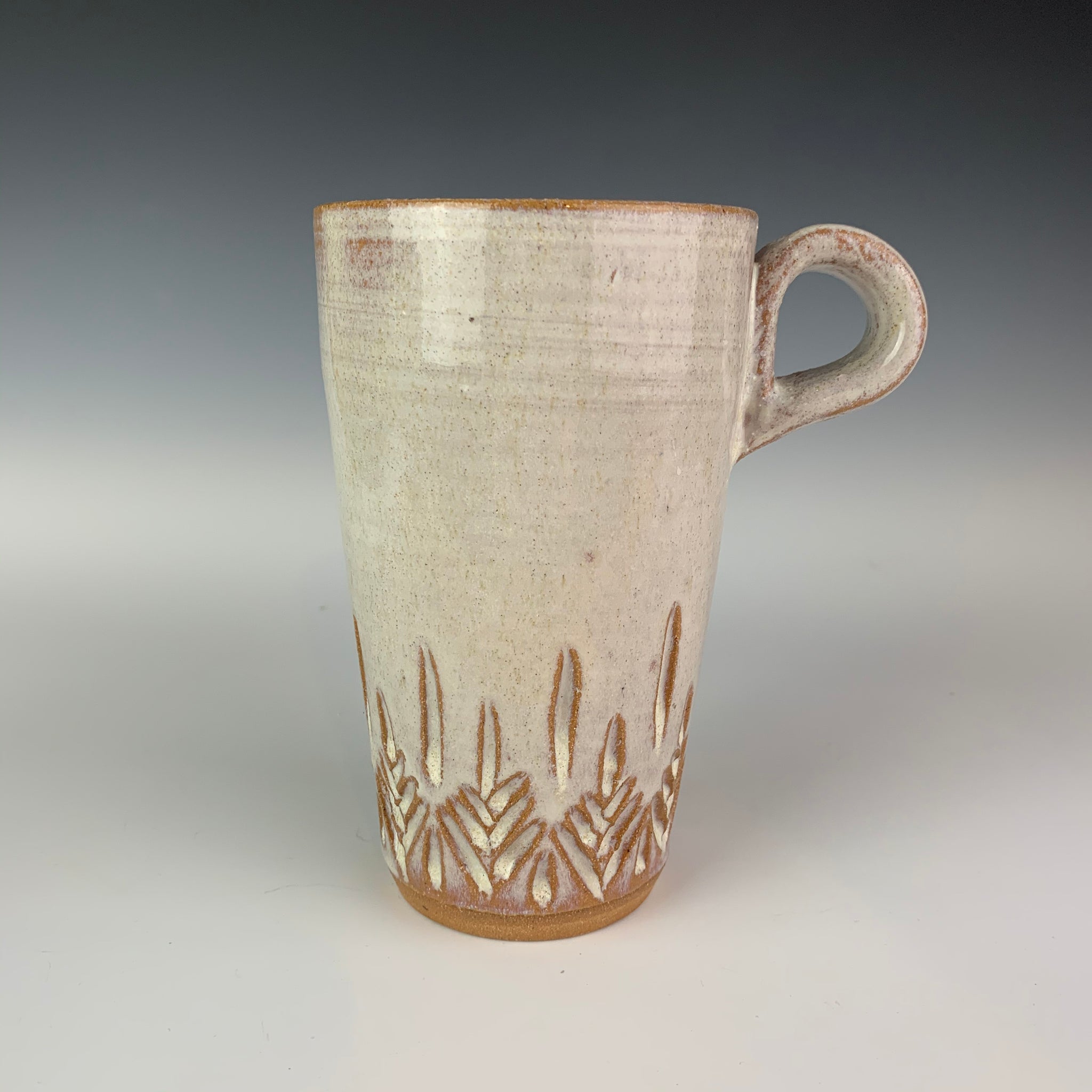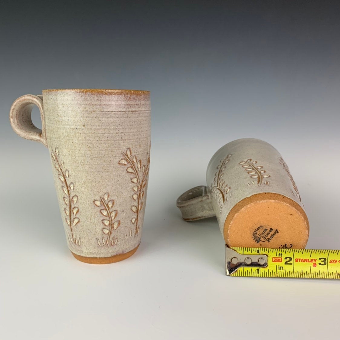 After drying and firing I glazed it in a speckled white glaze allowing the rich red clay to show through and accentuate the edges of the carved texture. Travel mugs hold about 14-16 fluid oz (tall latté to go!). They are lead free, microwave and dishwasher safe. This purchase is for ONE mug, but more may be available. They are made one at a time so no two are exactly alike, but they are very well matched. Expect some slight variation in the hand-carved pattern. Lead-free glaze, dishwasher and microwave safe.