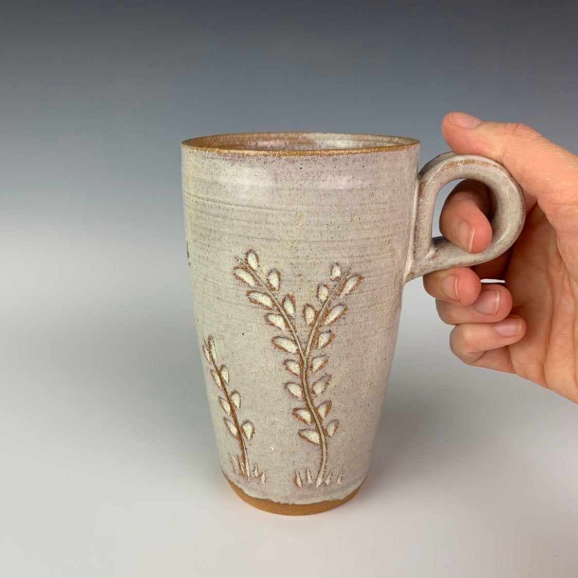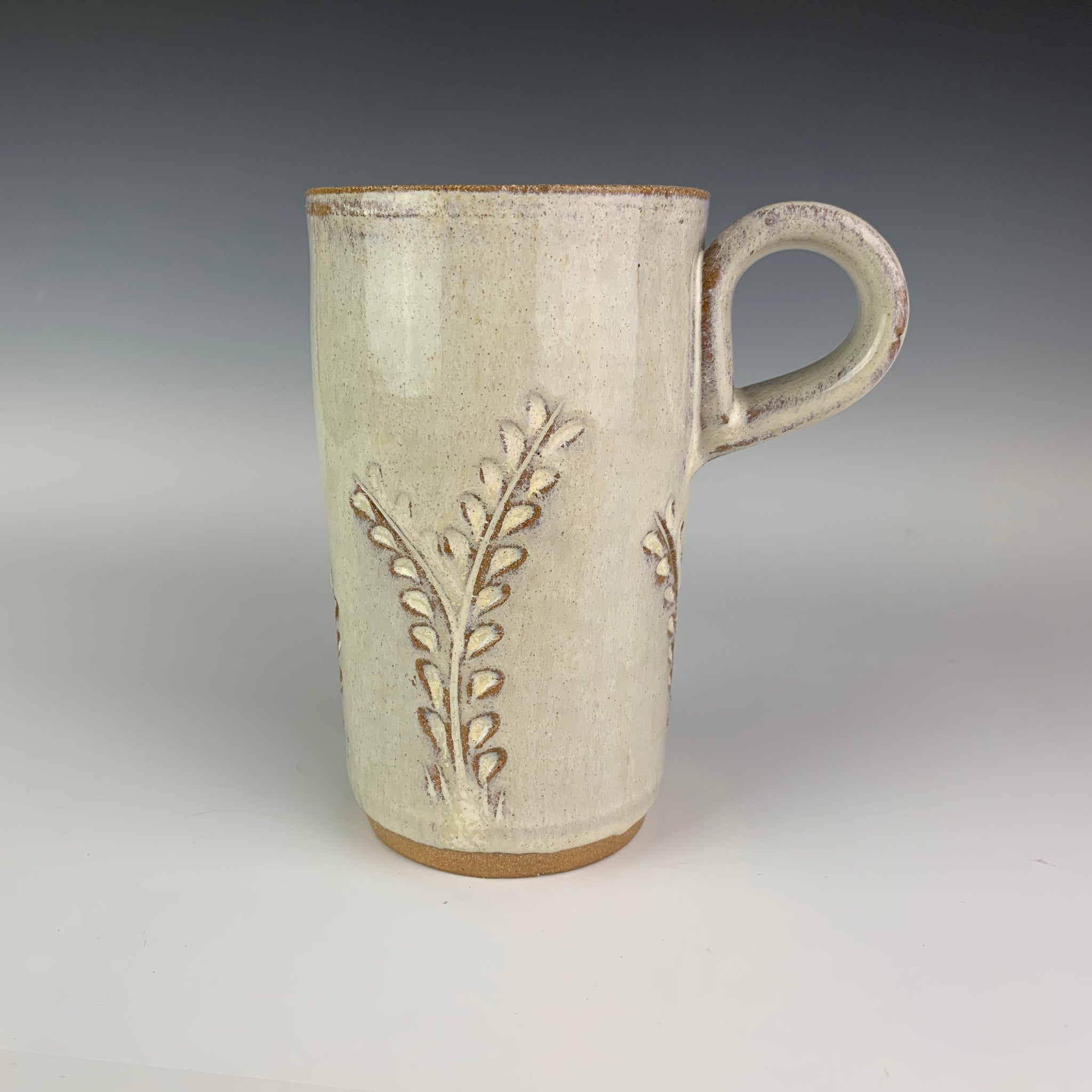 Pottery travel mug with finger loop handle. thrown on the pottery wheel, red clay, carved with vine pattern, white speckled glaze