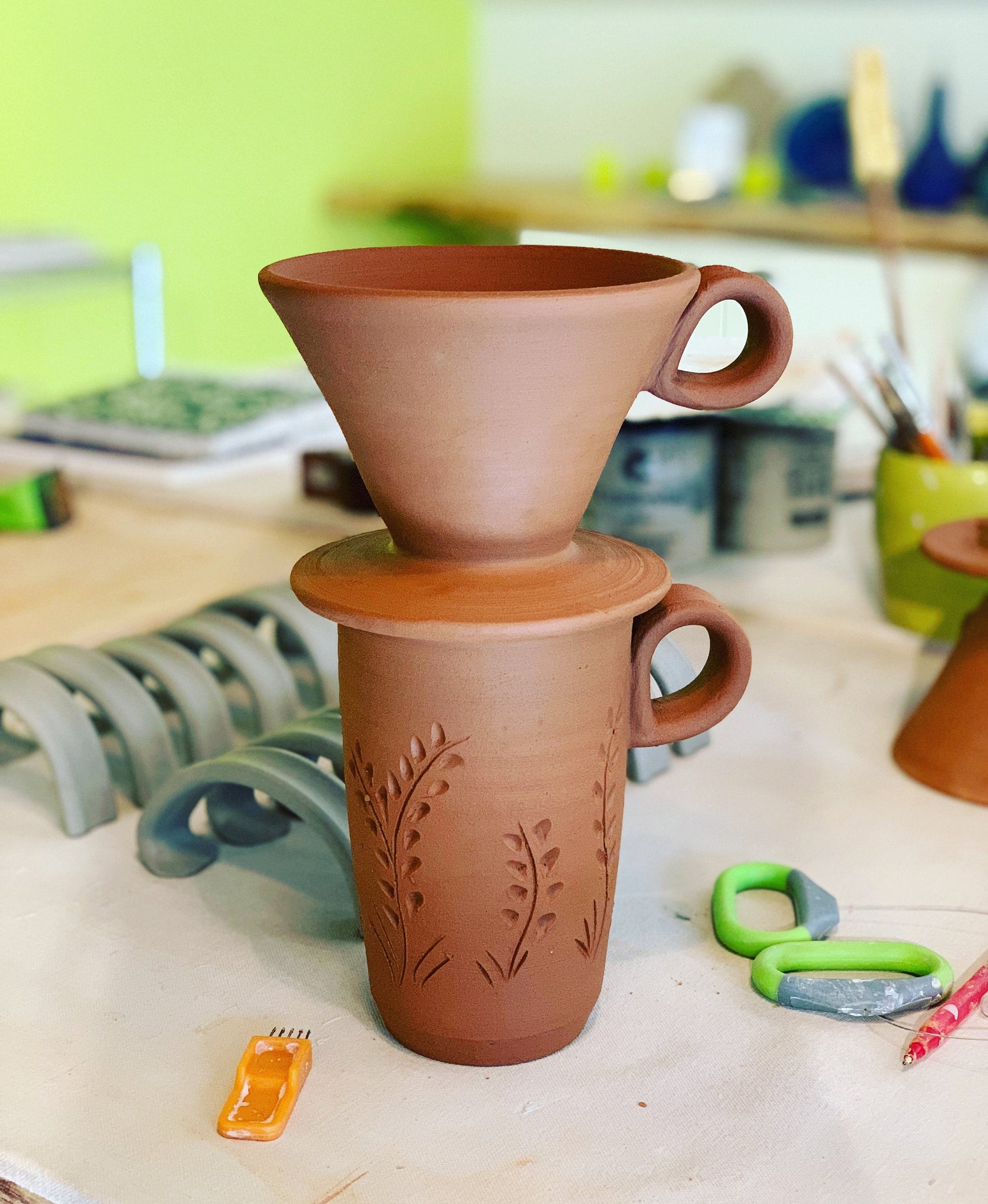 Travel mug and coffee pour over as they are being made in the pottery studio. The red clay is shown before it is glazed or fired. on the work table are handles for more mugs and pottery tools