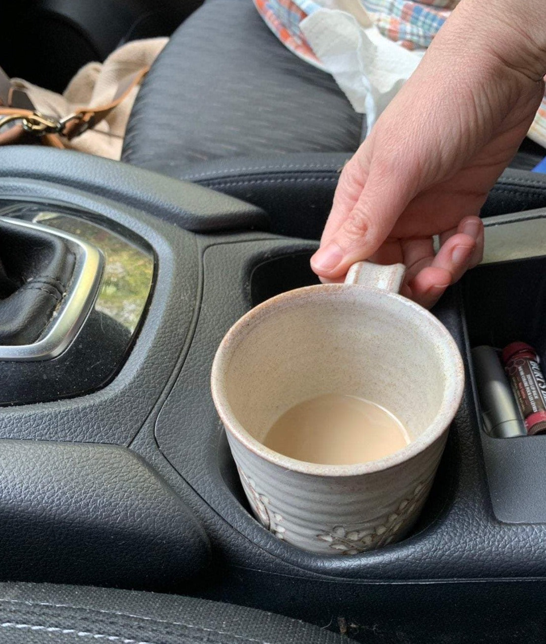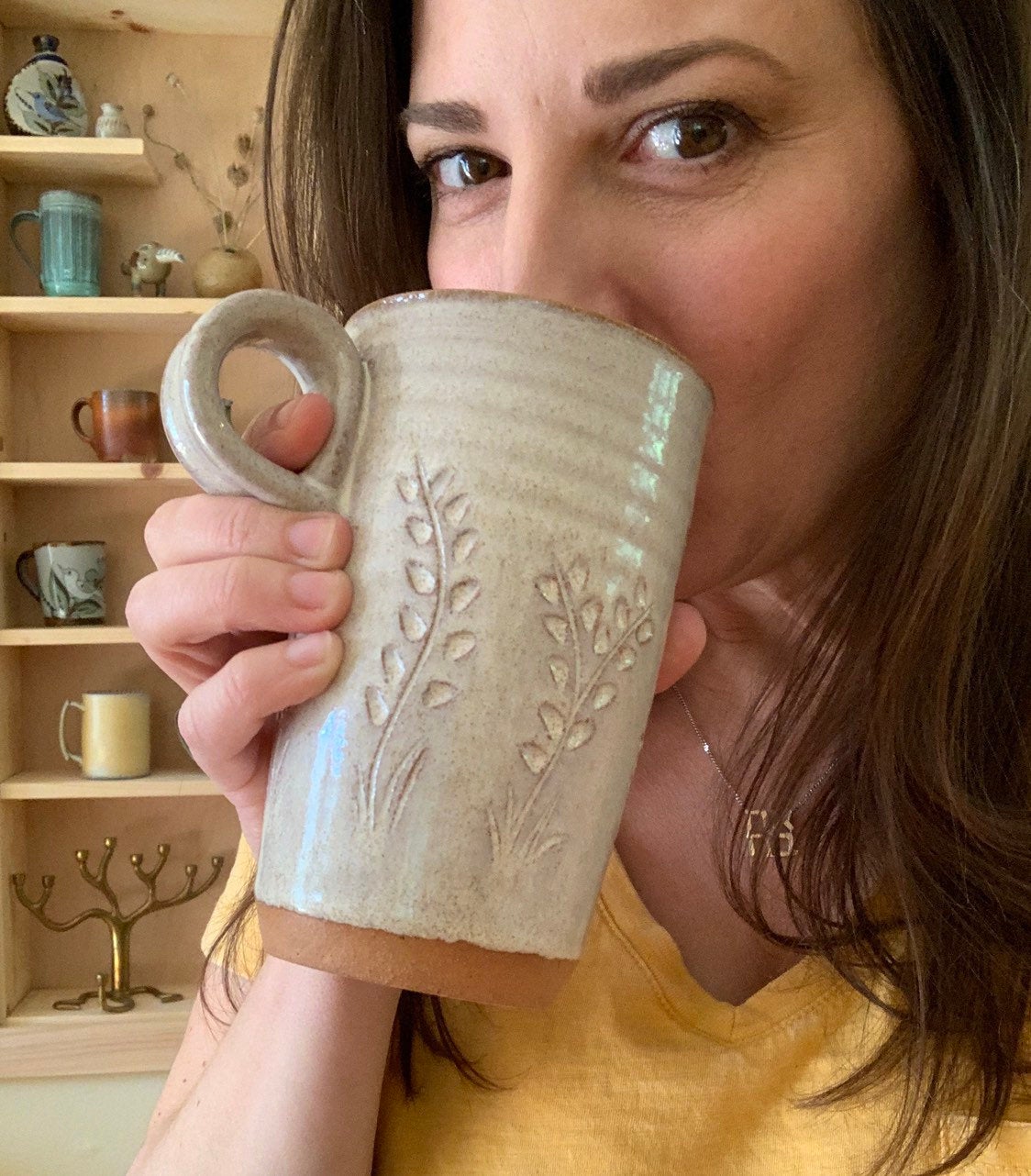 The artist drinking from her travel mug. wheel thrown in red clay, carved, white glaze. finger loop handle so it fits in cupholder