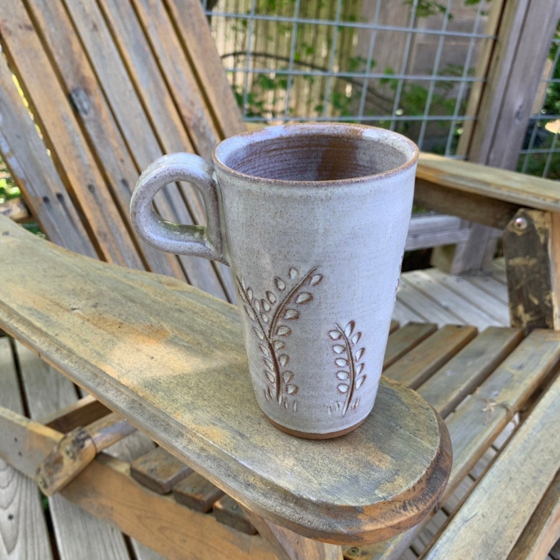 tall latte size travel mug with finger loop handle. vine carvings and white glaze. shown on adirondak chair