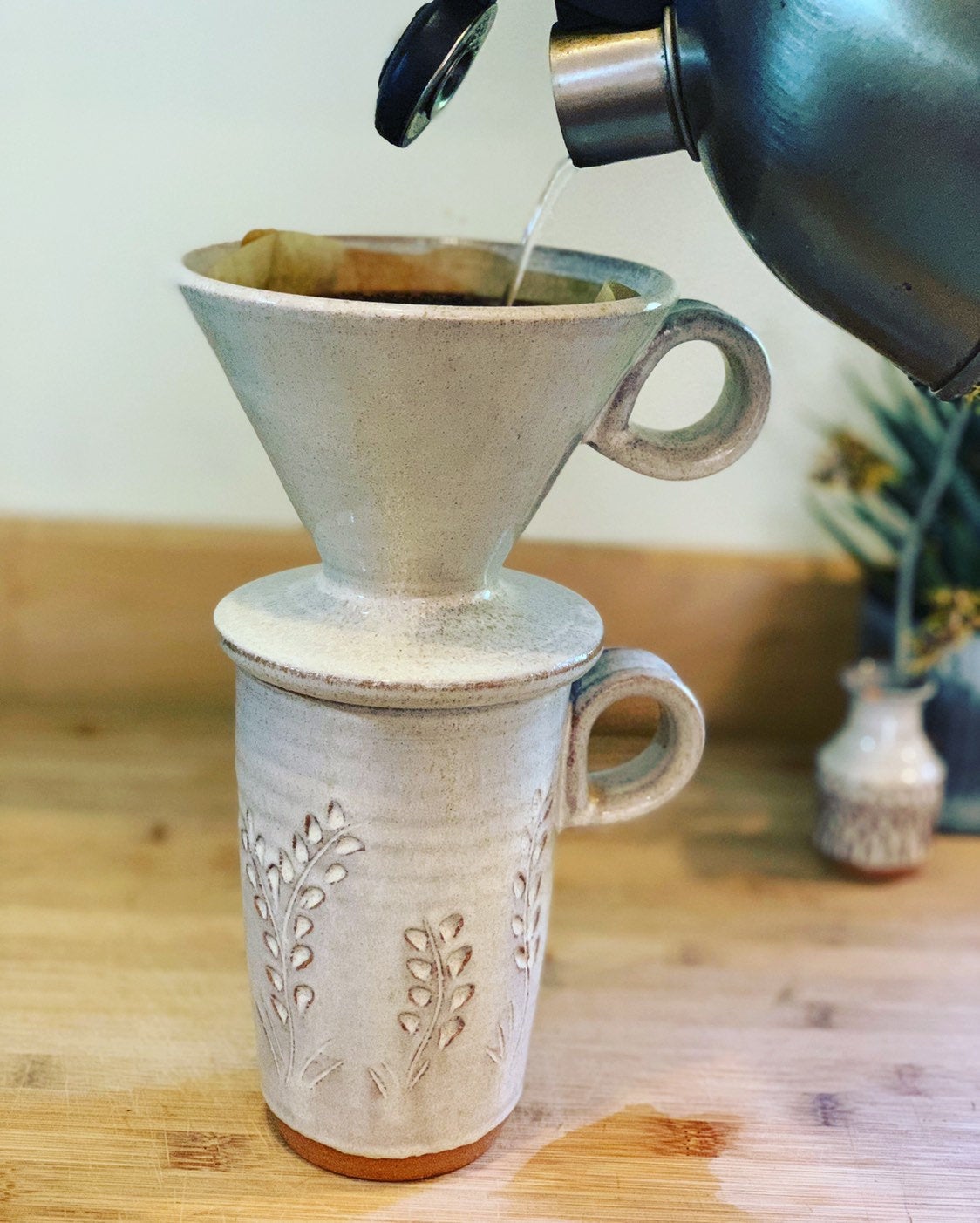 travel mug shown with coffee pour over. both are thrown on the potters wheel in red clay, the mug is carved with a vine pattern and they are glazed in speckled white glaze