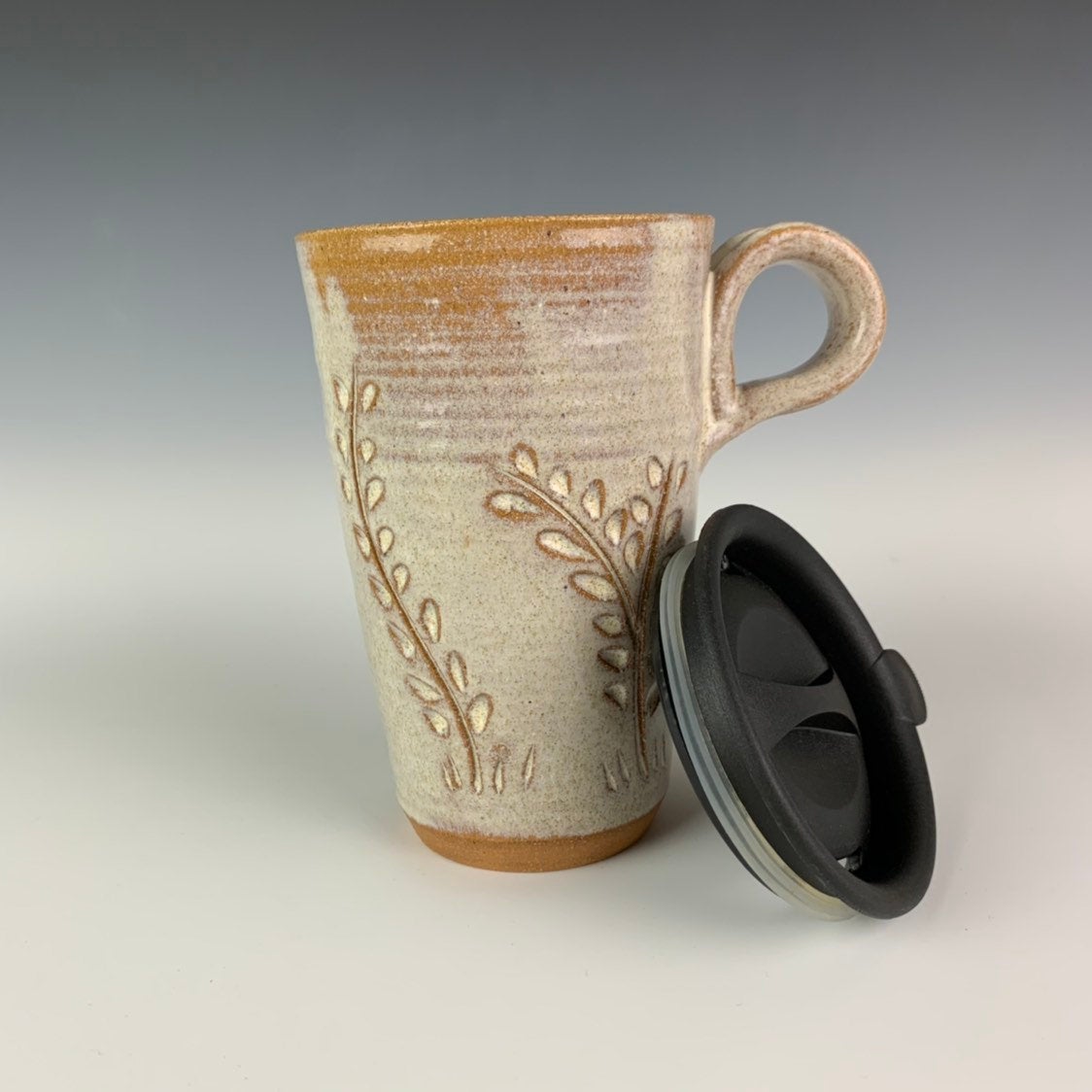 wheel thrown pottery travel mug with vine carved pattern, shown here with it's fitted lid