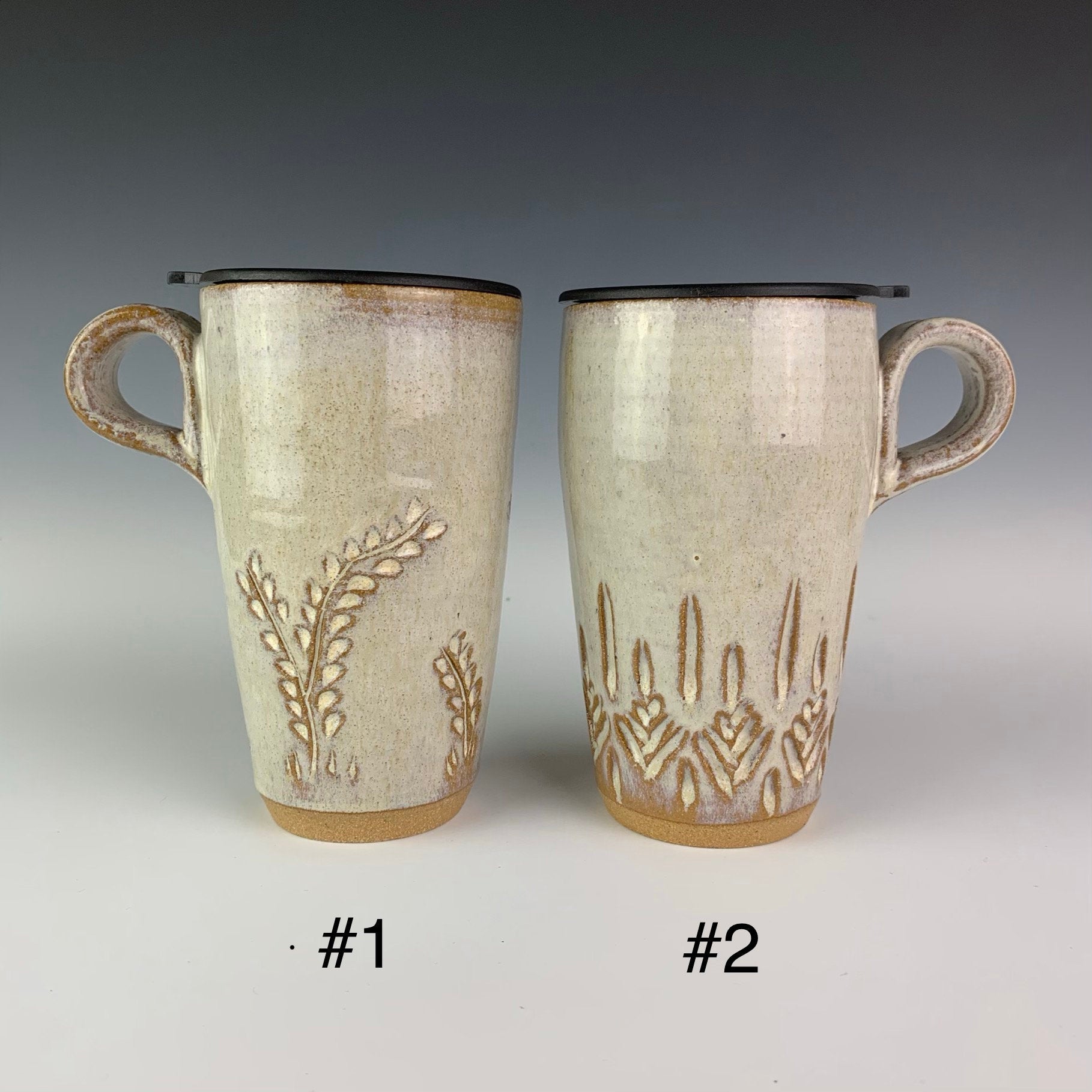 artist made Pottery travel mugs with lids. Mug #1 shows the vine pattern, mug #2 shows a carved tree-like pattern. mugs have finger loop handles so that they fit in cupholders
