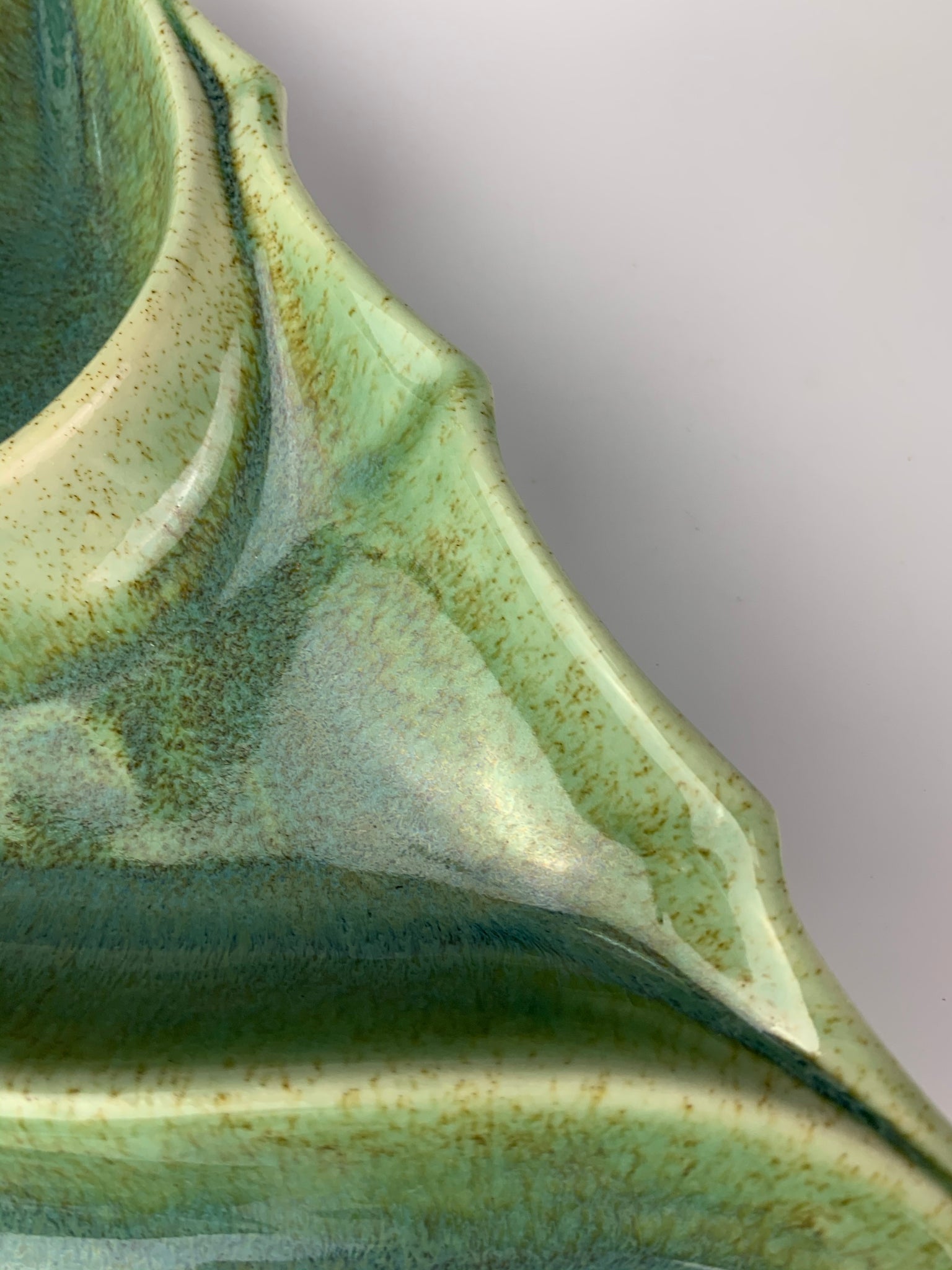 detail image of speckled green glaze on christmas tree candy dish. mossy green with brown speckles pooling where melted