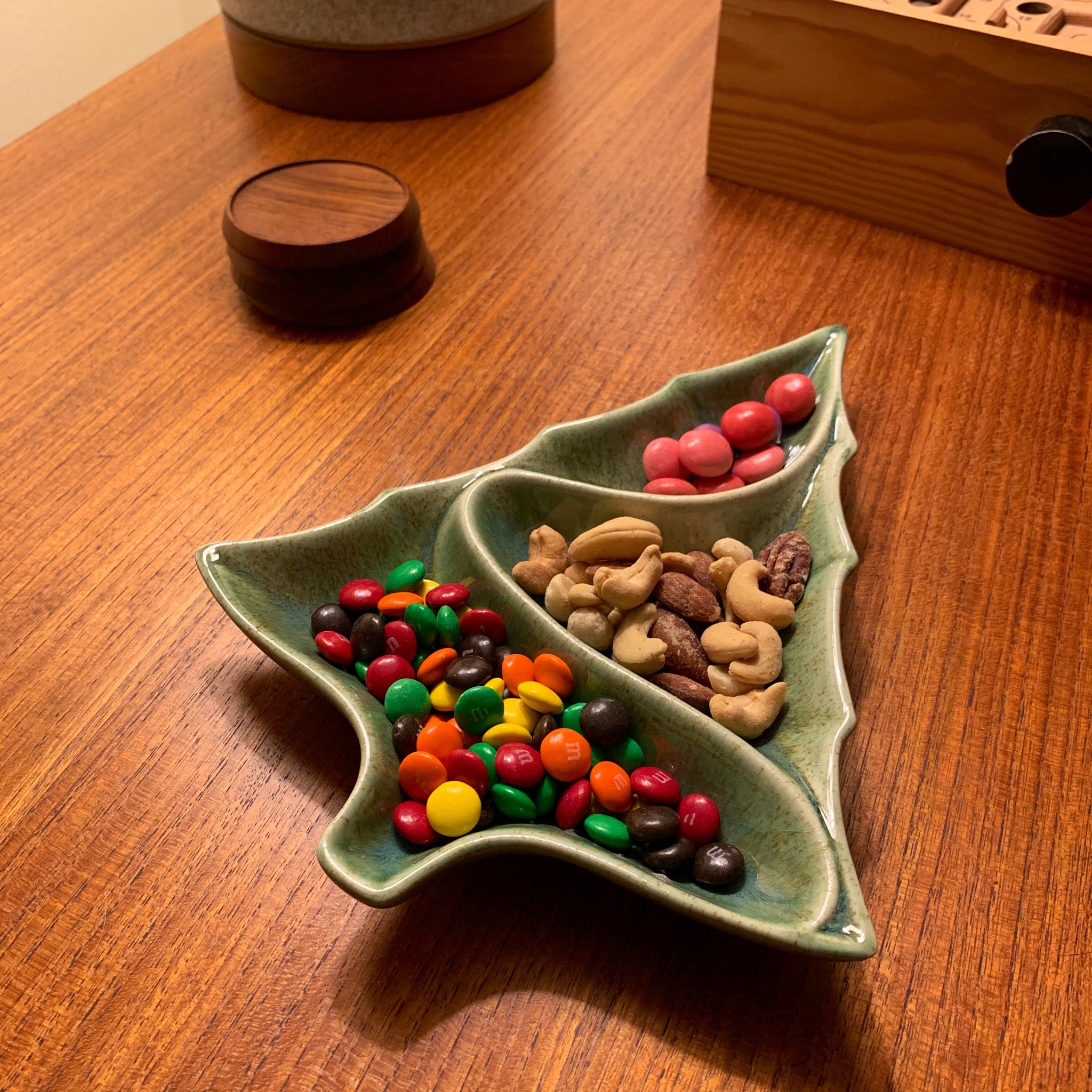 vintage decor. divided christmas tree candy dish in speckled green ceramic