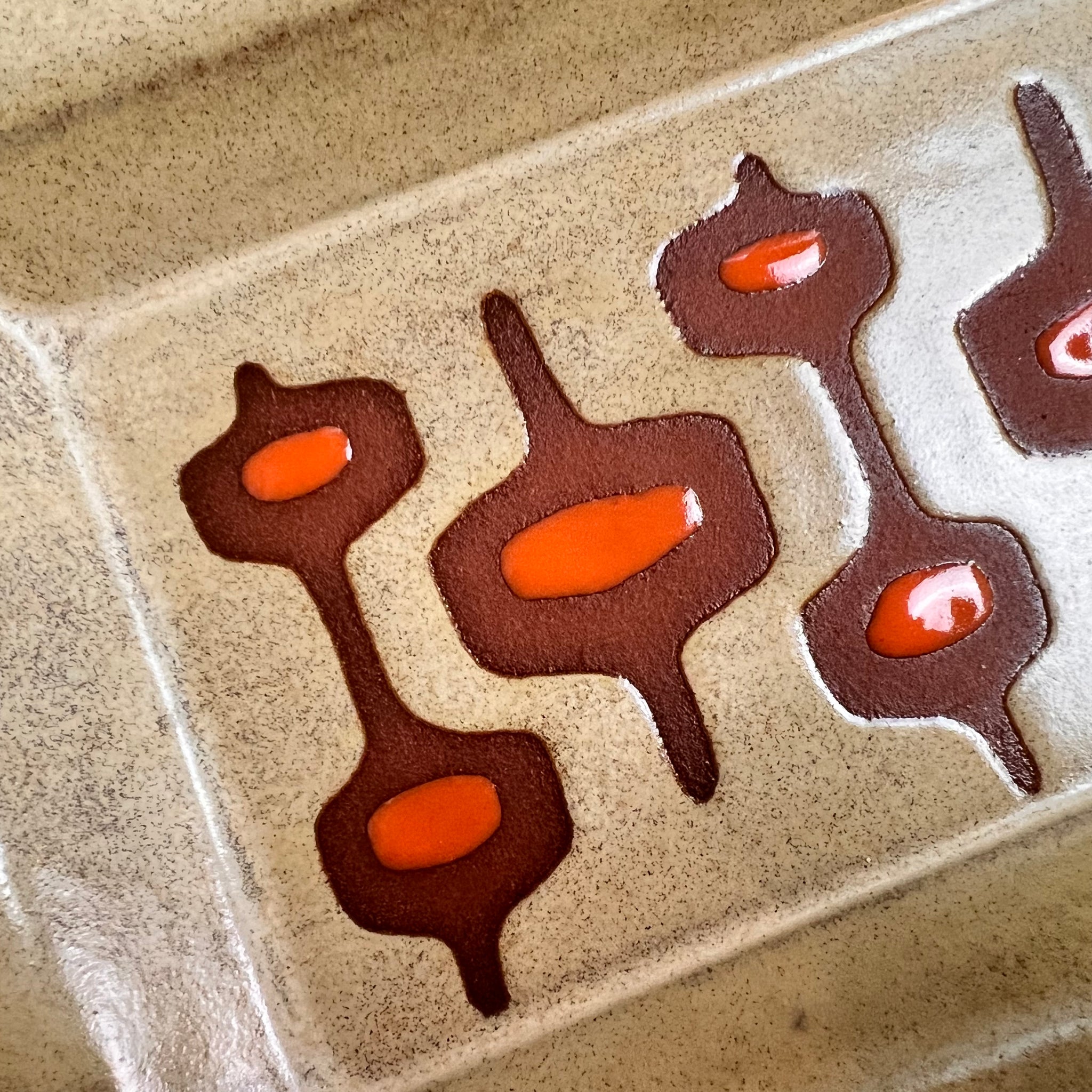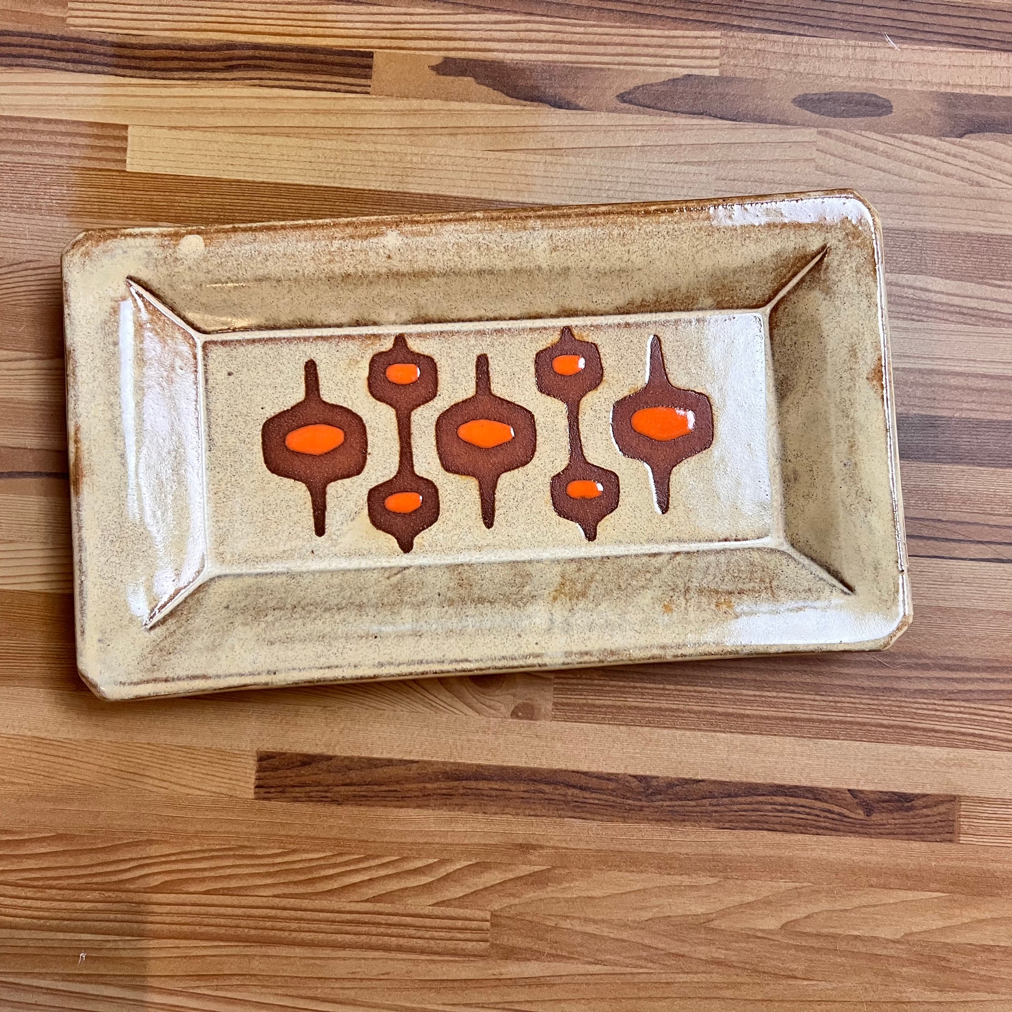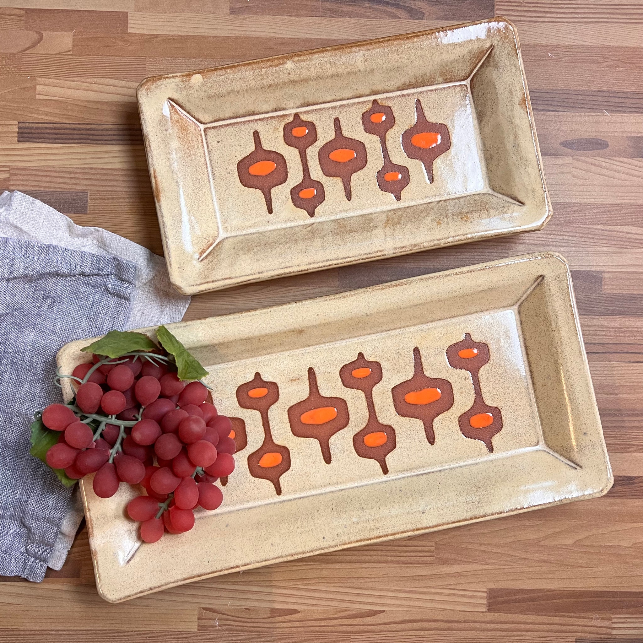 MidMod serving ware, freshly made to match your Mid Century Modern Aesthetic! These serving platters are made from a red-brown stoneware clay (not terra-cotta!). The trays are handcrafted with a footed bottom and a raised rim.