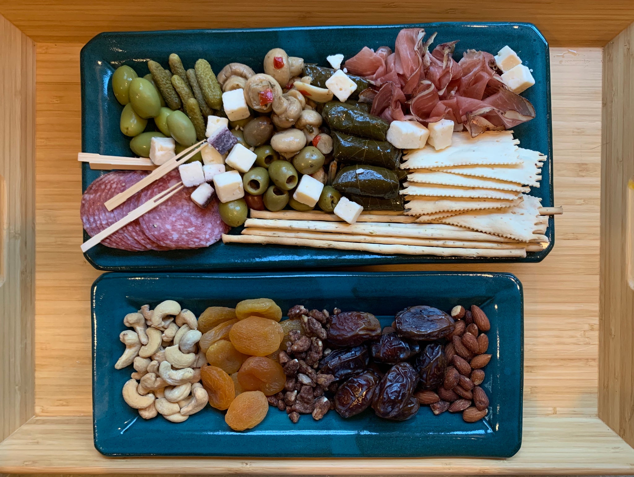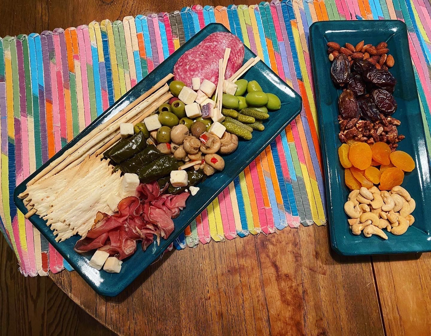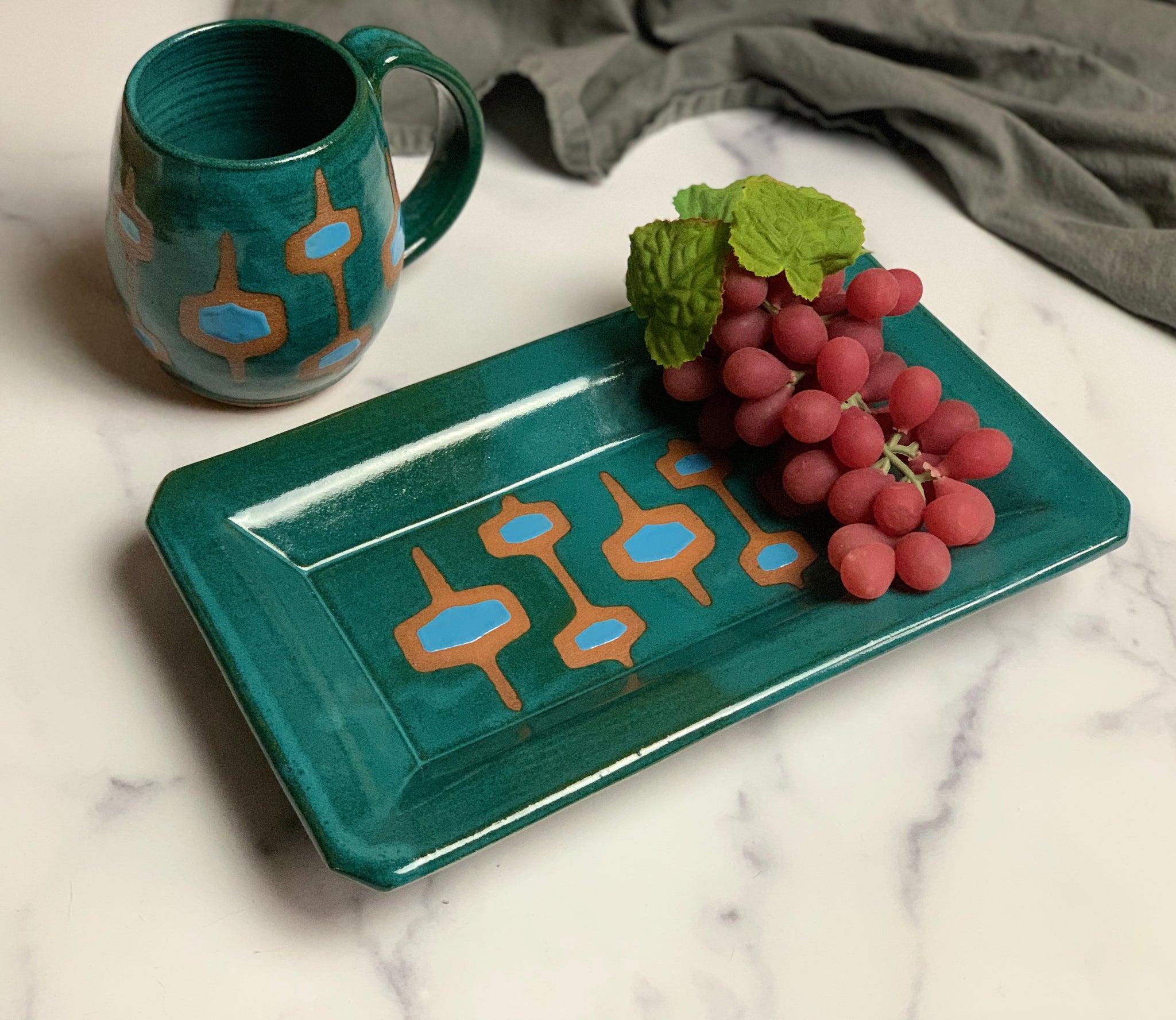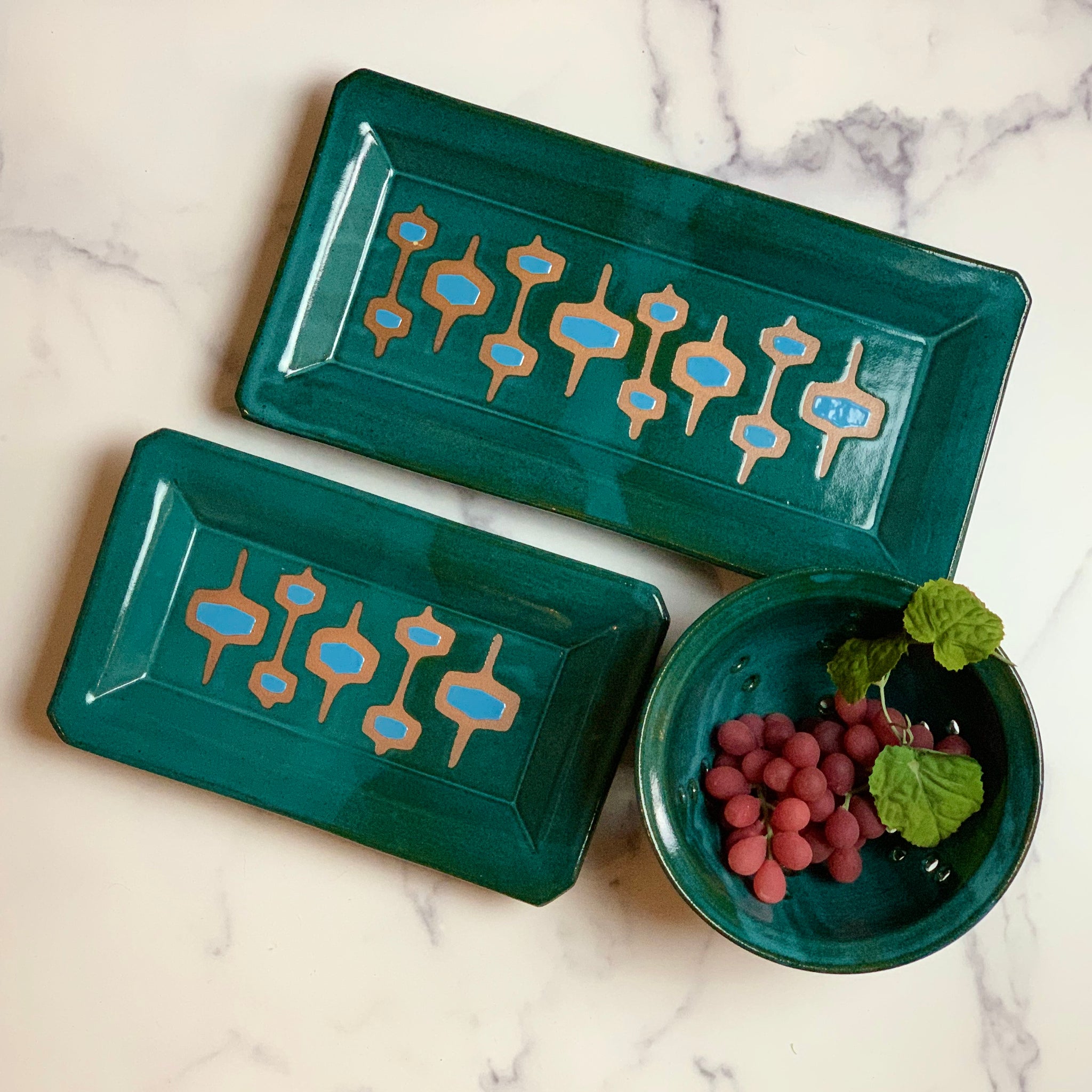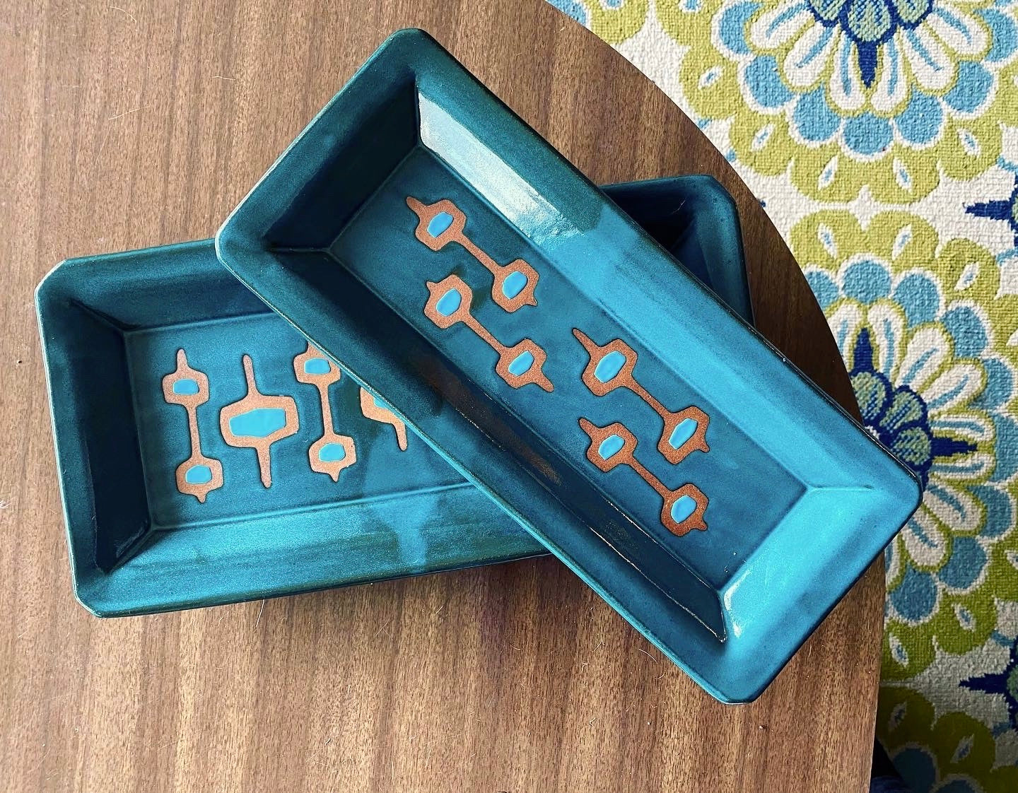 Each tray is hand decorated with a resist pattern of "stacked-round-squares" that reveals the beautiful red clay beneath. The center of each round-square is glazed with a bright accent color and the rest of the tray is glazed in a rich Teal or Dijon. They are, of course, food safe and can be microwaved or warmed in the oven. Made to be used and enjoyed!