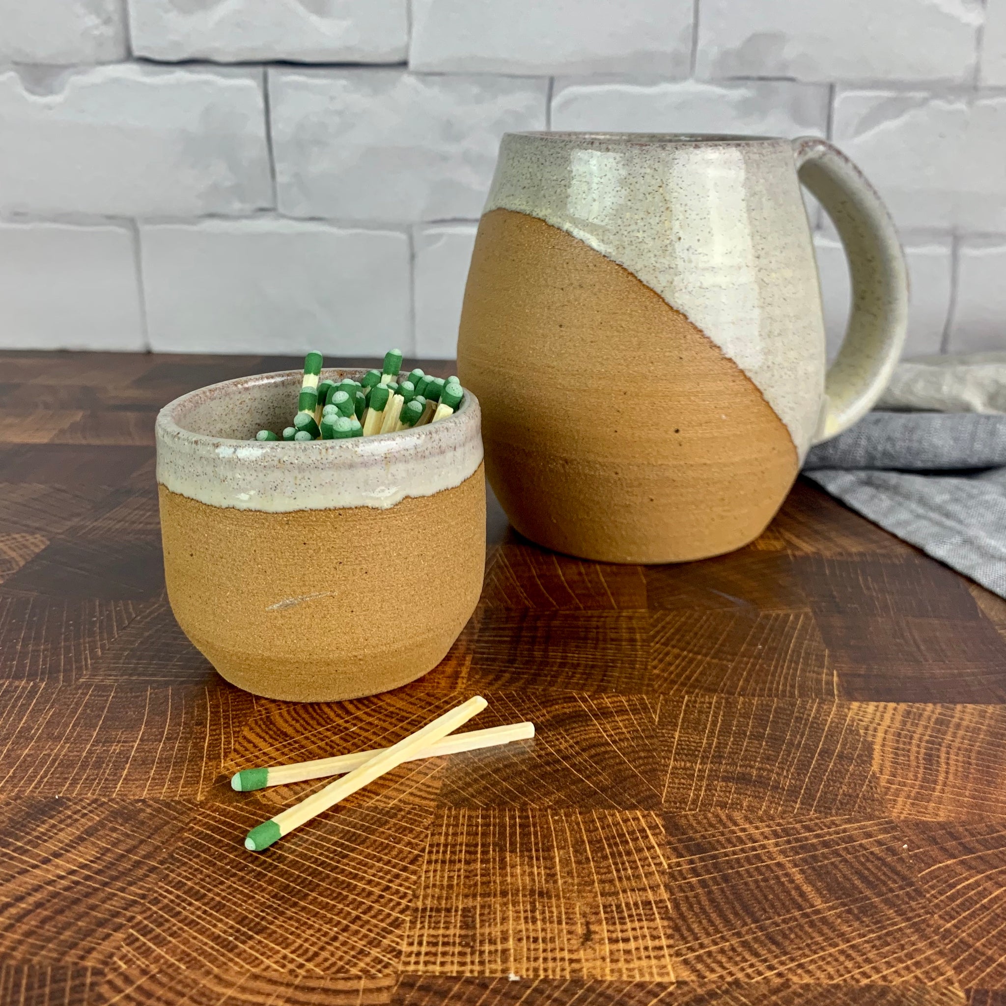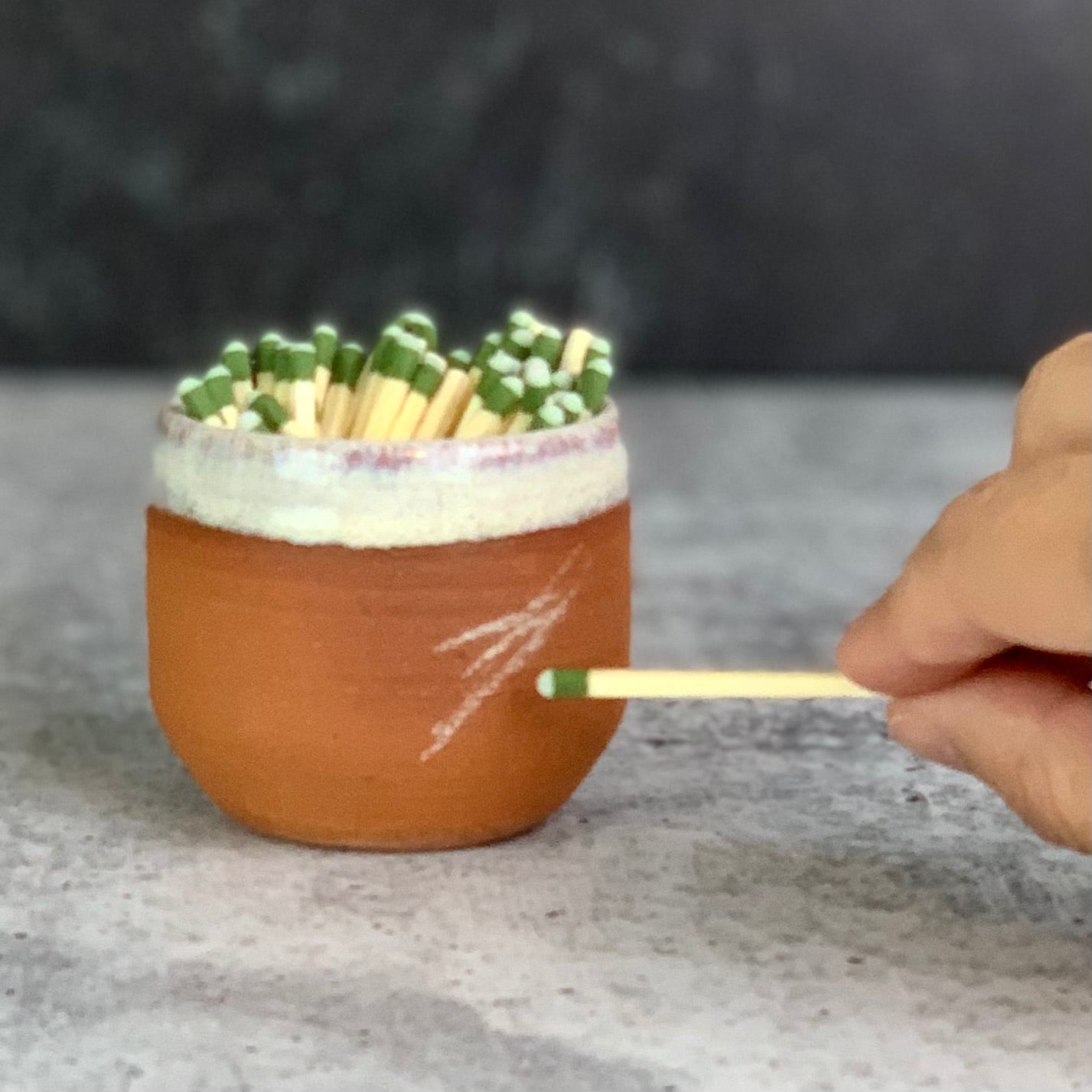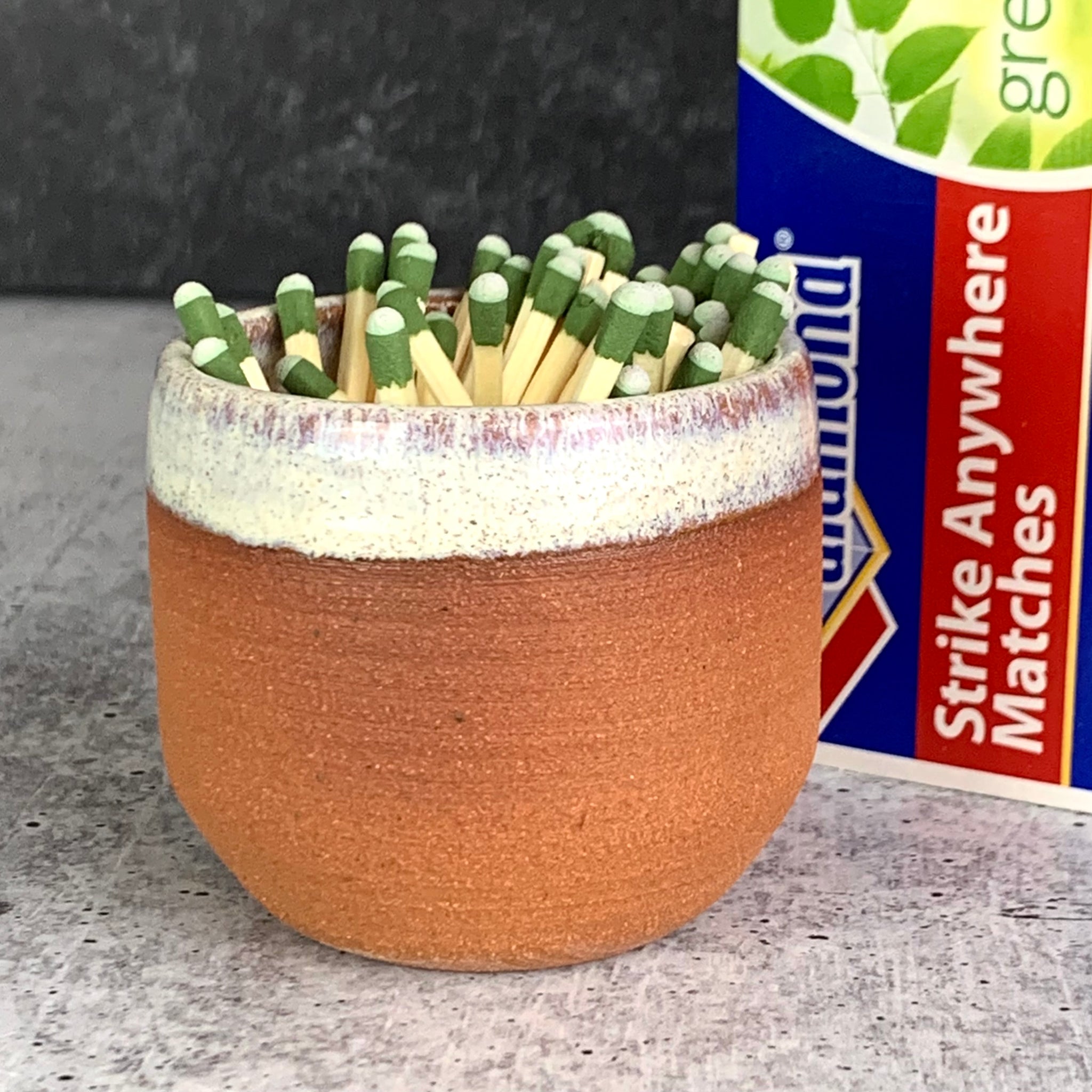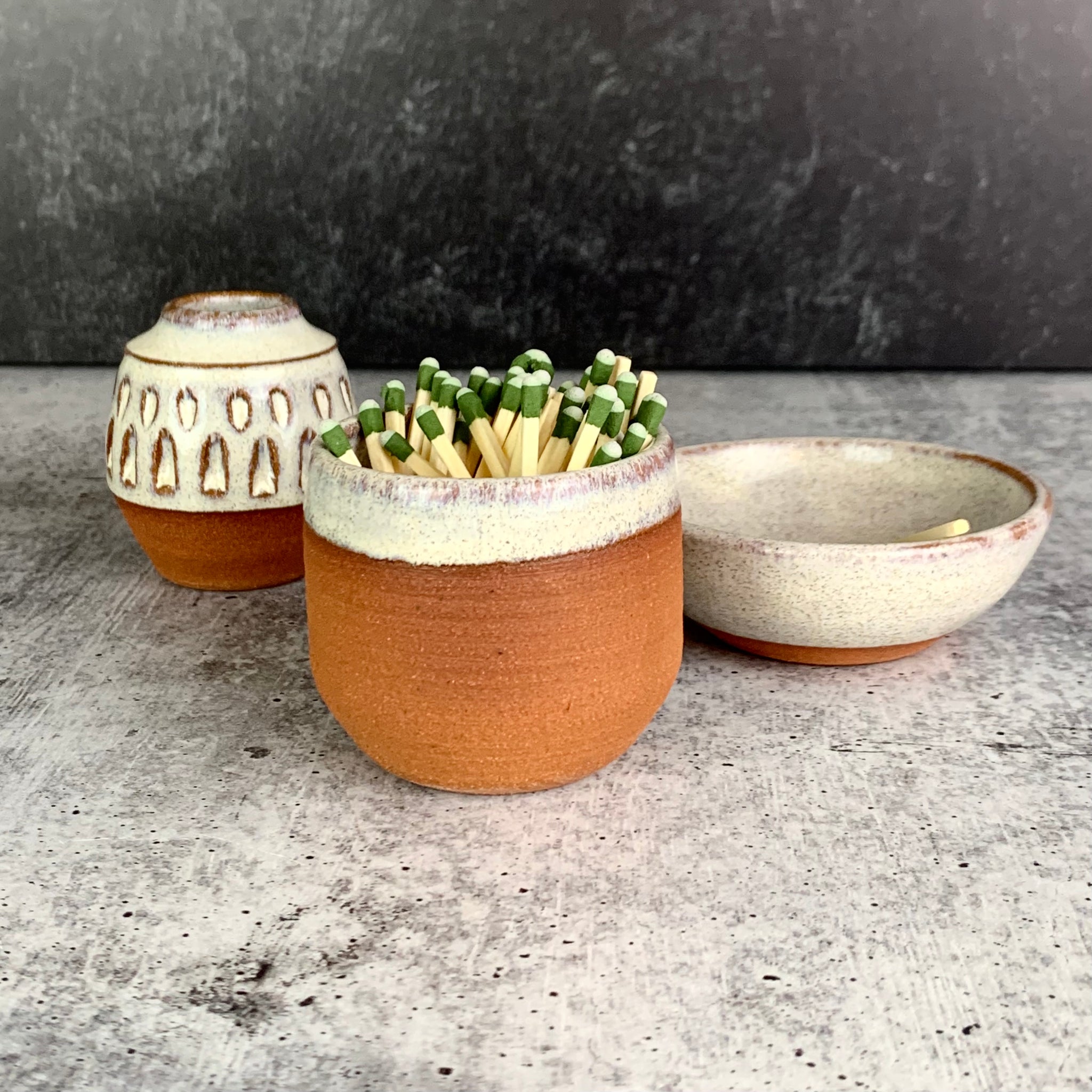 Strike on pot! Keep your matches stylish and handy in a sweet wheel thrown Pottery holder, and strike your match, right on the pot. These little dishes are thrown on the potter's wheel by Meredith at Fern Street Pottery. The pots are thrown with a warm red/tan stoneware clay. After drying and firing I glazed it in a speckled white glaze while leaving room for the rich red clay to show and be space to strike your match- yes it works! Match pots are 1.5- 2" tall. They are made one at a time on th potters wheel, in the woods on Fern Street.