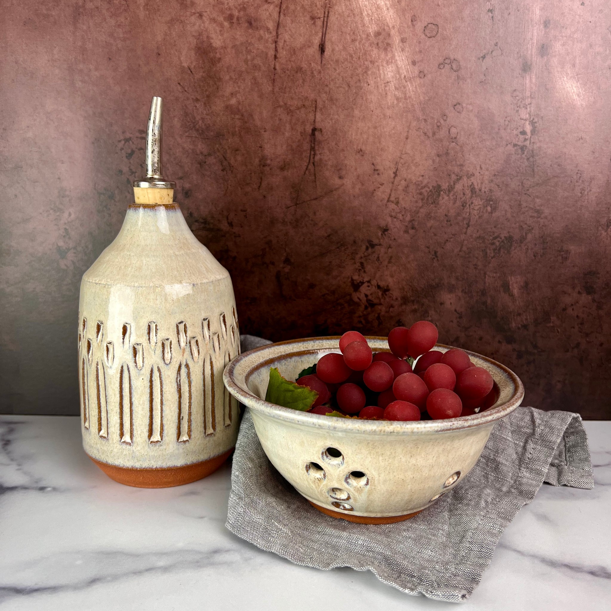 Olive oil cruet, shown with a pint sized berry colander.. Wheel thrown and carved. cork stopper  for smooth pouring. Thrown in a red stoneware clay and carved by hand. the white glaze accentuates the carved pattern where the red clay shows through.