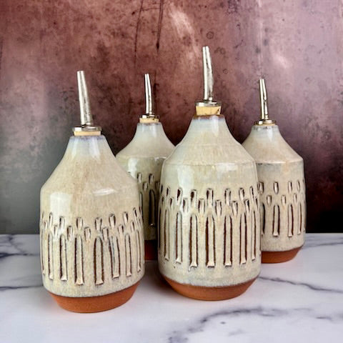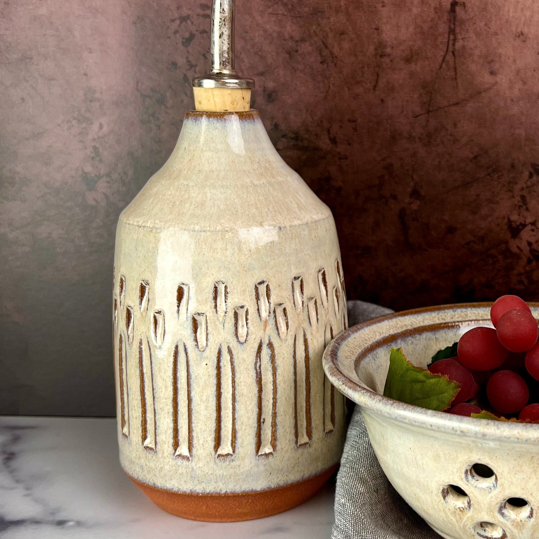 Oil Cruets are wheel thrown so no two are exactly alike, each has a hand carved pattern. They are approximately 6" tall and 7.5"- 8" tall with cork pourer/stopper. Lead-free, food safe glaze. Available in Rustic Speckled White glaze.
