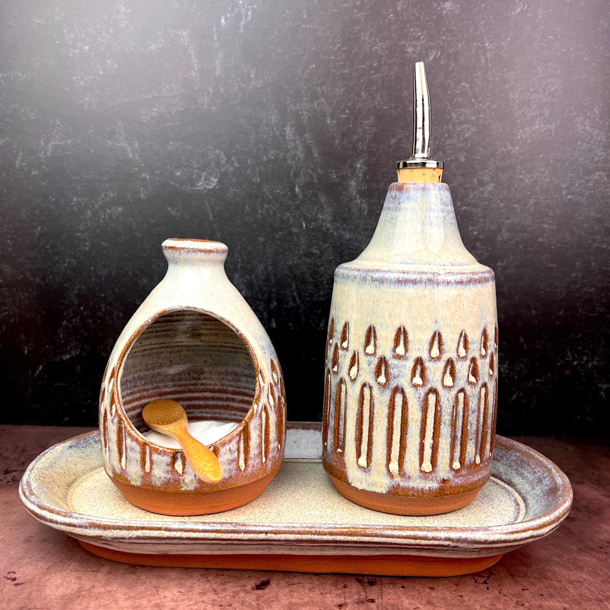 Salt cellar and Oil Cruet set with matching tray shown together here.  Made in  a red stoneware clay, carved and glazed in a speckled white glaze.