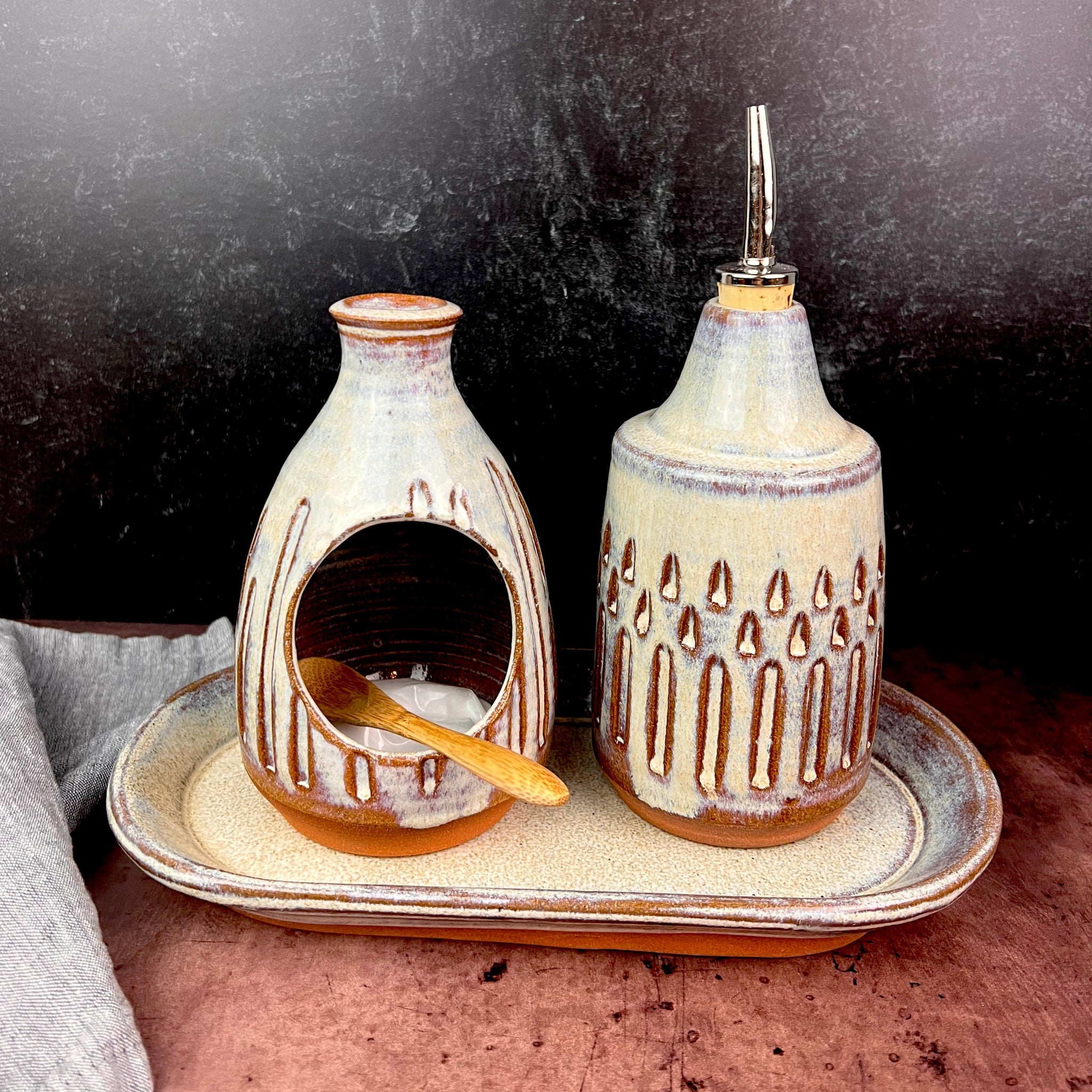 (sold out for 2022) A Pottery Olive Oil Cruet is a beautiful, convenient and functional way to utilize olive oil in your kitchen. Add beauty, to your kitchen and subtract mess. Let it stand on display next to your cooktop. No need to pull that giant, drippy bottle from costco out of the cupboard every time you cook! The cork pour spout has a tiny air valve allowing for a smooth pour, no glug-glug with this stopper. Finger tighten the cork spout- it will swell just a tad with the olive oil and may appear wet, but will not leak. Honestly, I don't know how people function without these, especially if you cook in a cast iron pan.